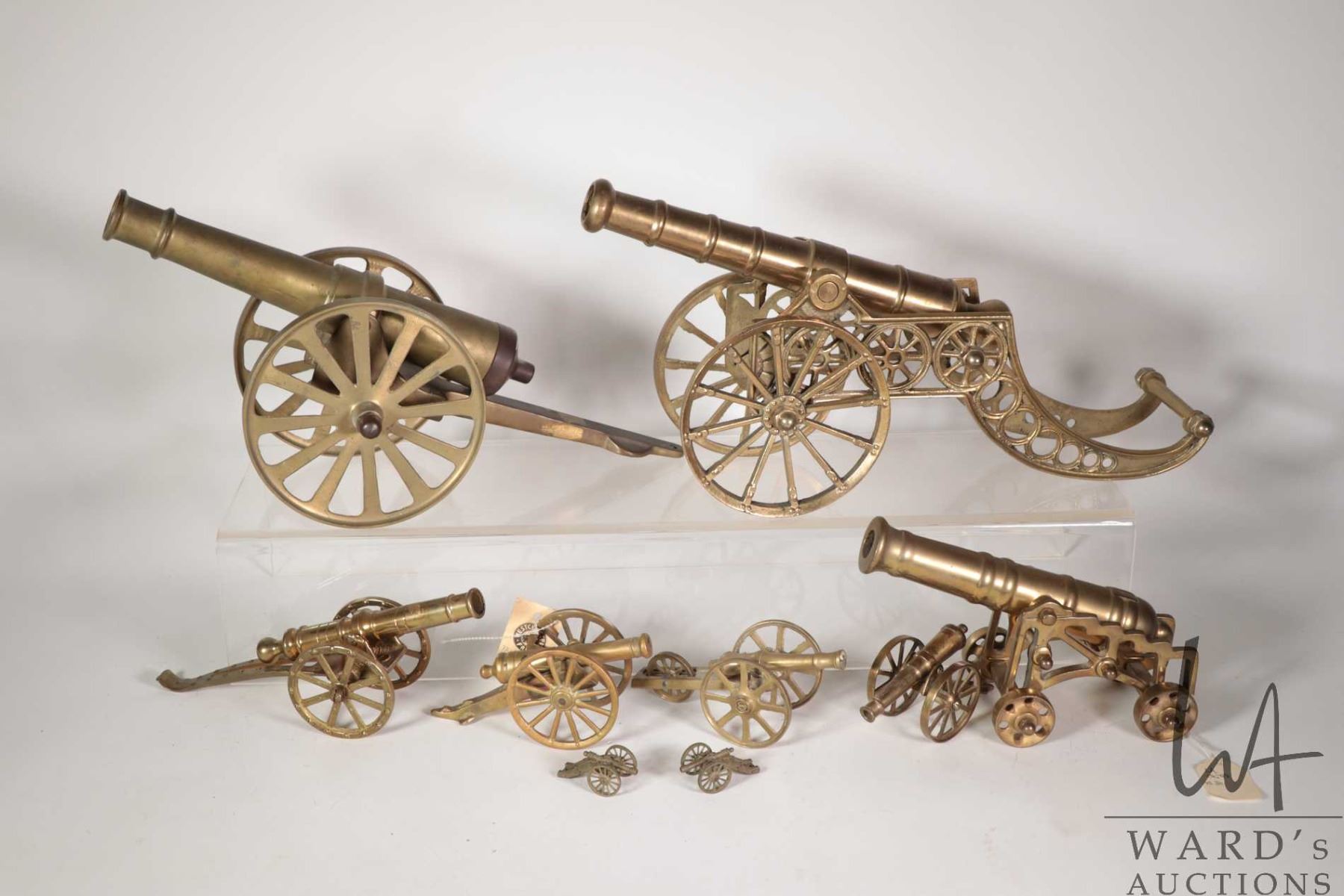 Selection of nine vintage brass collectible cannons, ranging from 1" - 16"