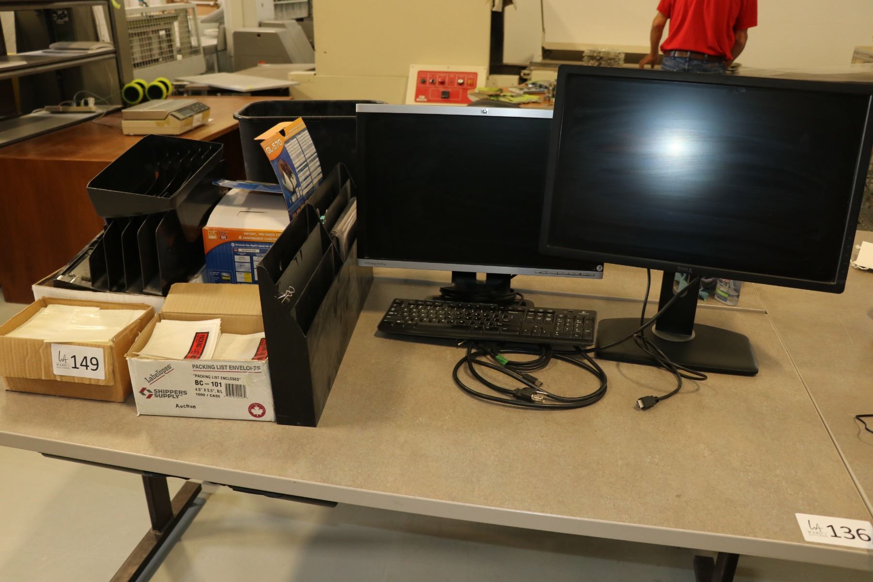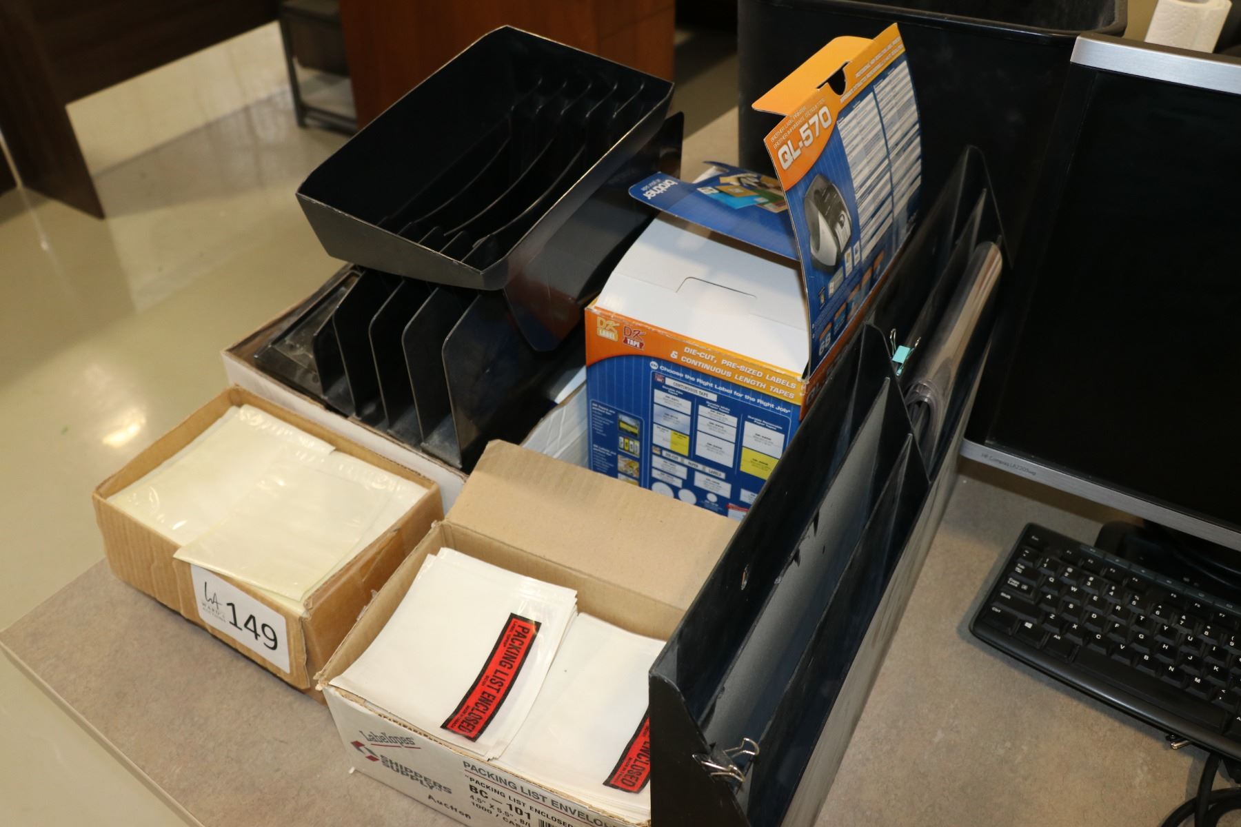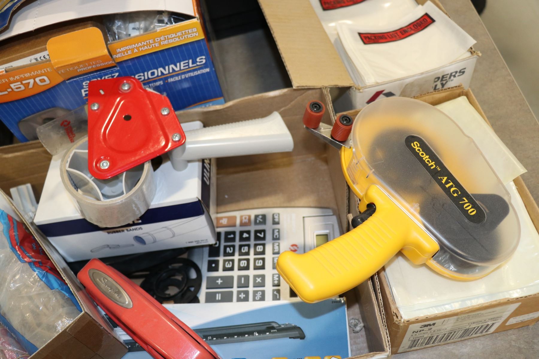 Selection of office supplies including two monitors, desk organization, GL570 printer, tape guns, et