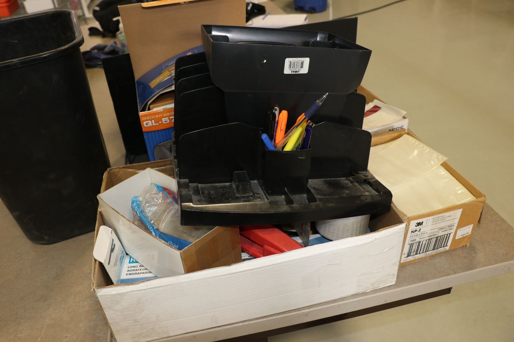 Selection of office supplies including two monitors, desk organization, GL570 printer, tape guns, etc.