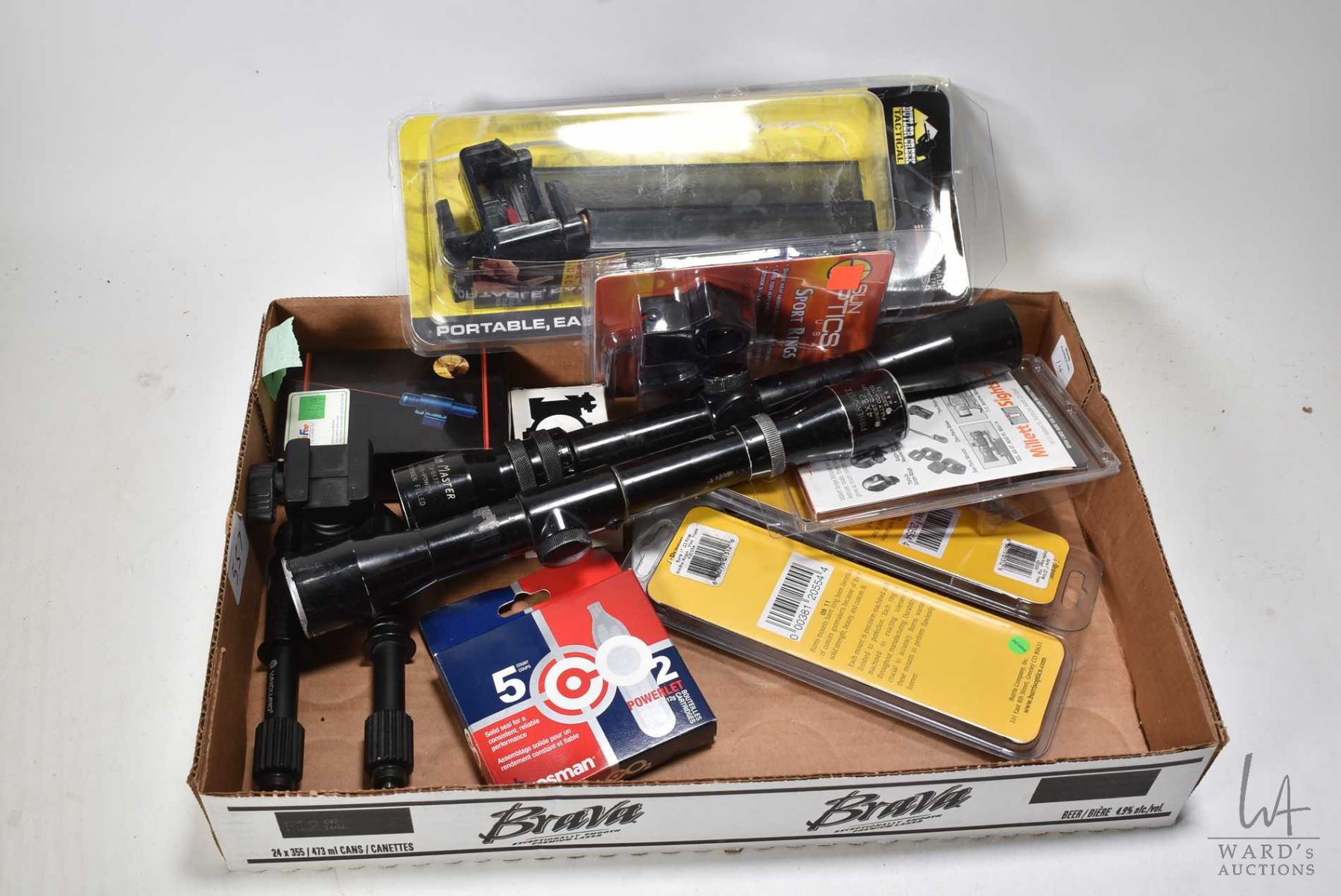 Selection of optics including vintage Fisher-Dietz 4X32 scope, an Aim Master 3X9X32 scope, assorted new in package rings including Burris, a speed loader, a rifle bi-pod, a boxed laser sight and a package of CO2 cartridges
