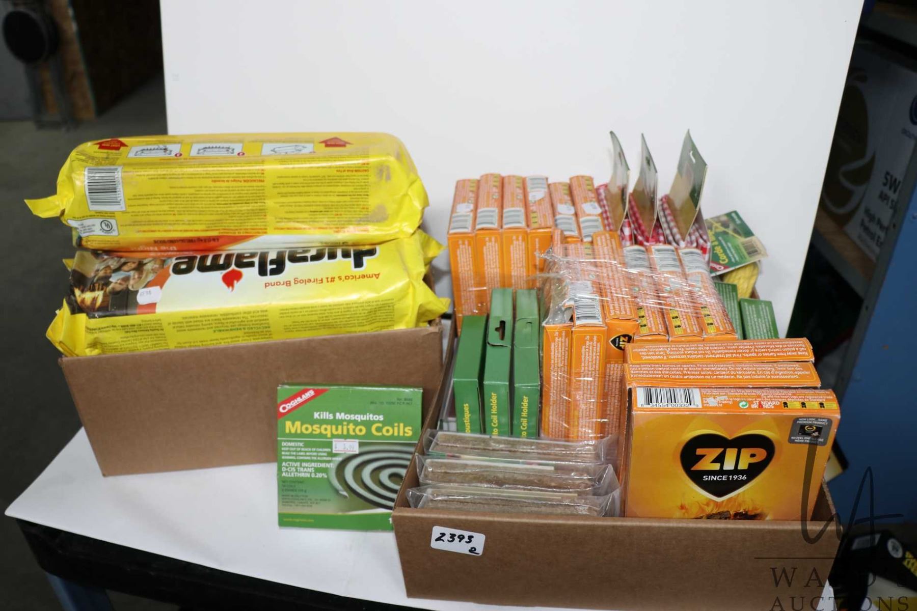 Selection of outdoor items including five duraflame logs, mosquito coils and holders, table clothes, rope and fire starter