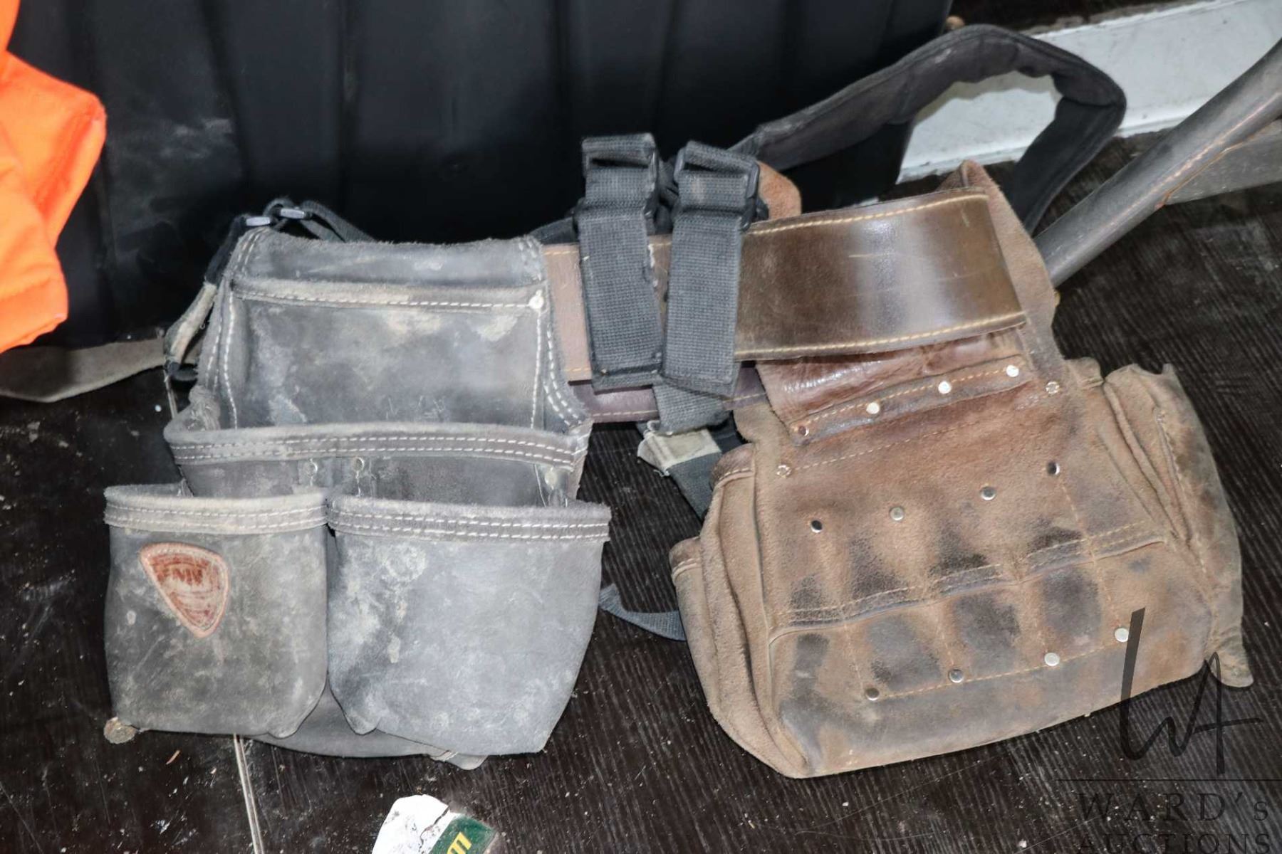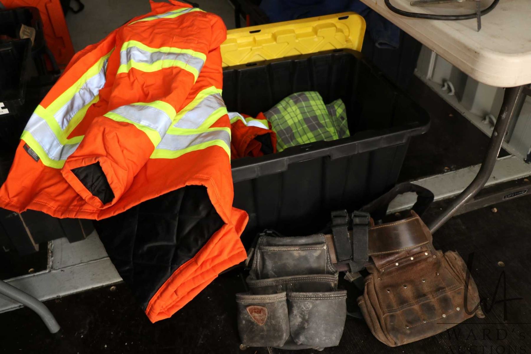 Selection of outdoor work clothing including a Tough Duck Hi-Vis jacket, assorted Hi-Vis clothes, and a leather tool belt with accessory pouches