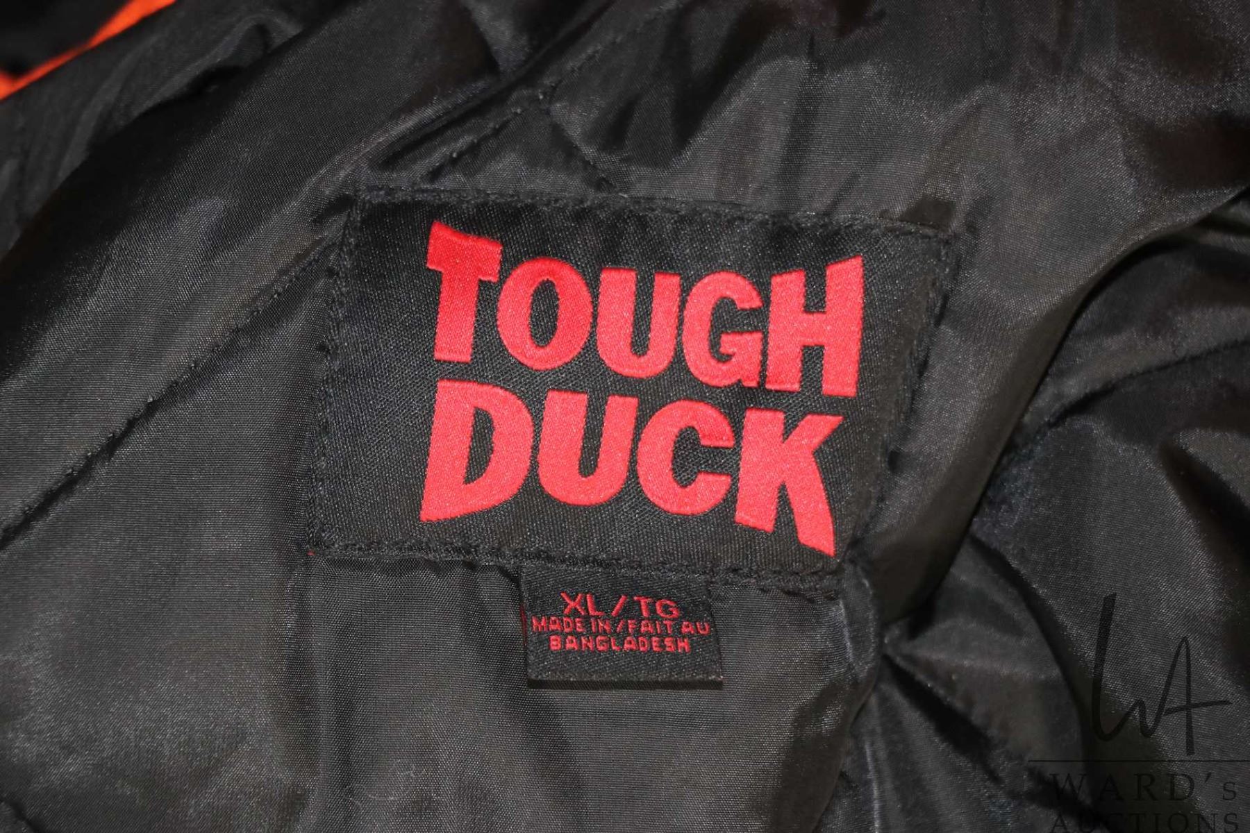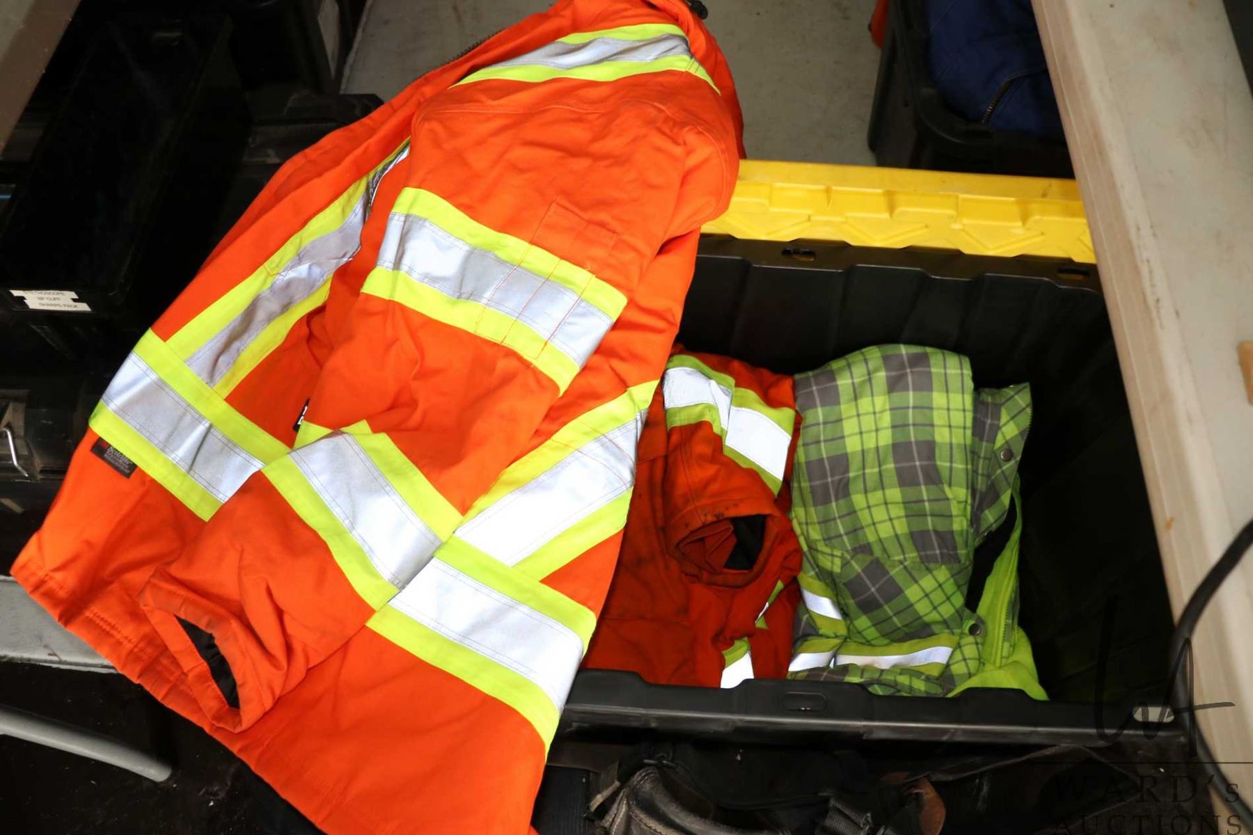Selection of outdoor work clothing including a Tough Duck Hi-Vis jacket, assorted Hi-Vis clothes, an