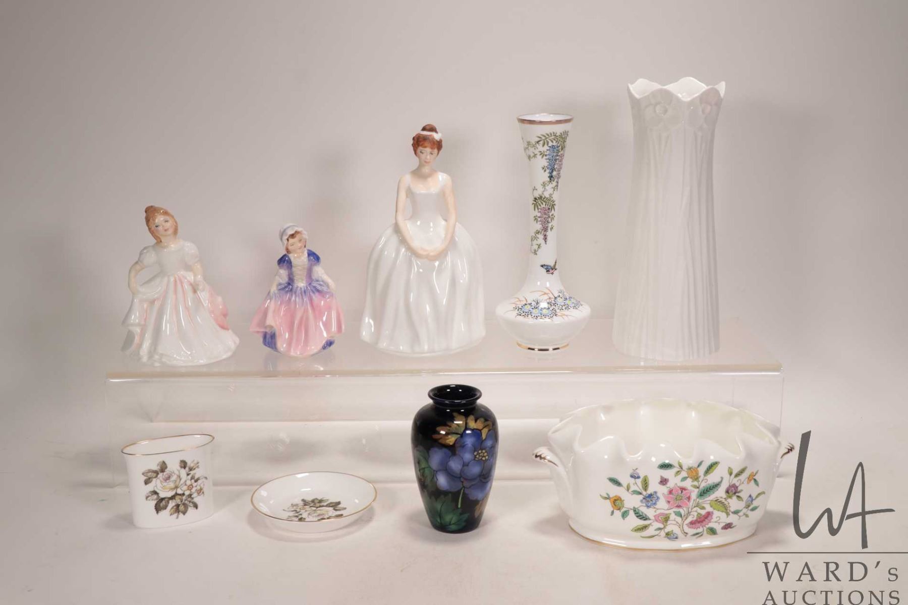 Selection of porcelain and china collectibles including Royal Doulton Embassador 9" vase, three Royal Doulton figures including Ann HN2739, Amanda HN2996 and Dinky Doo HN1678, small Jacobean English vase and a Minton Haddon Hall dish etc.