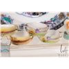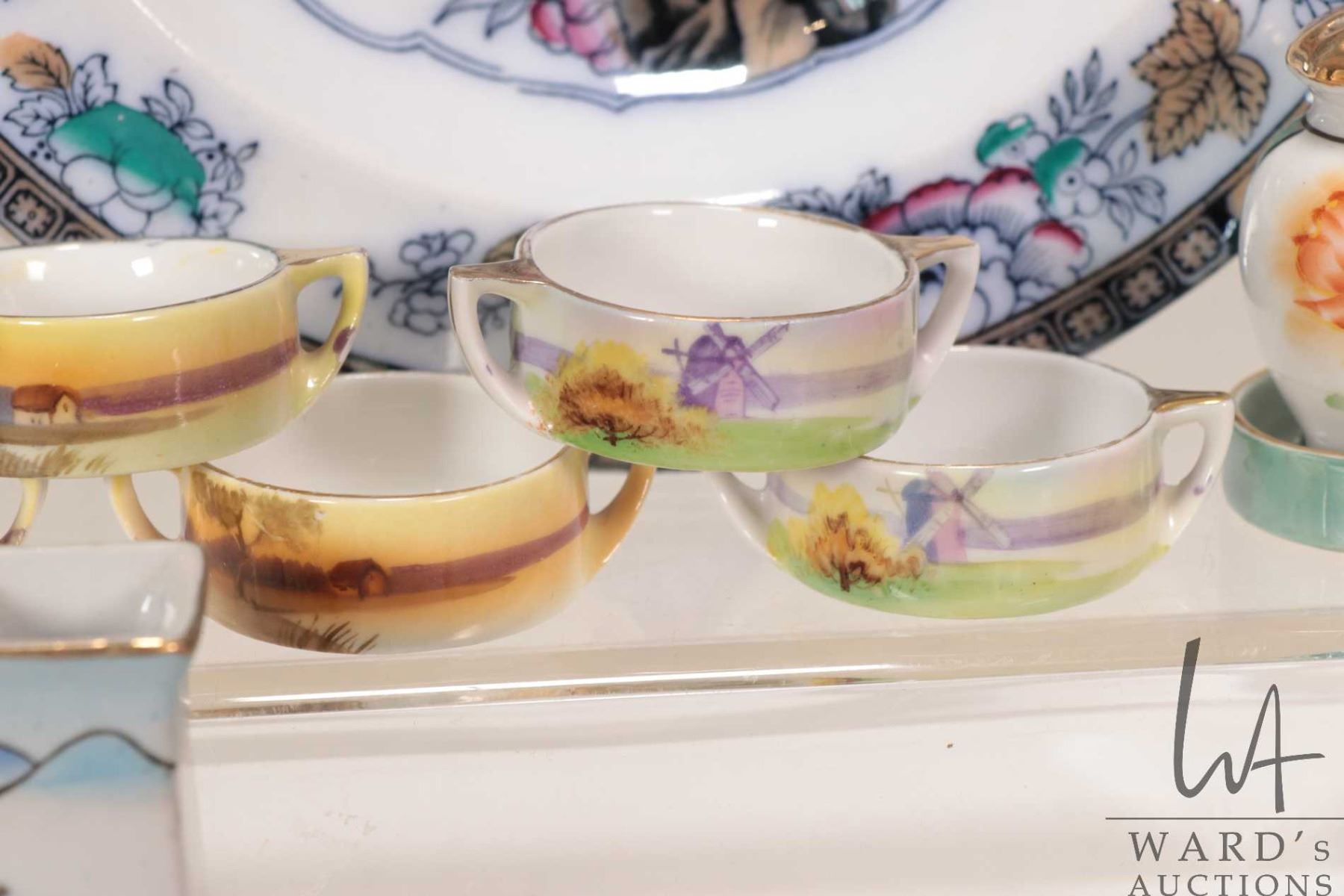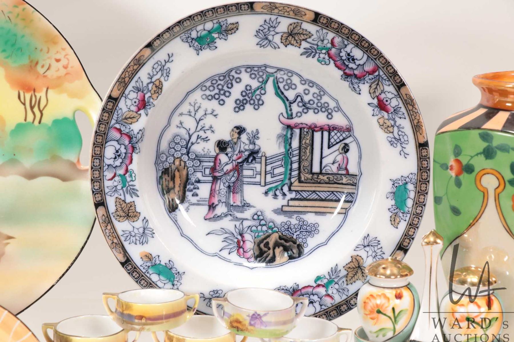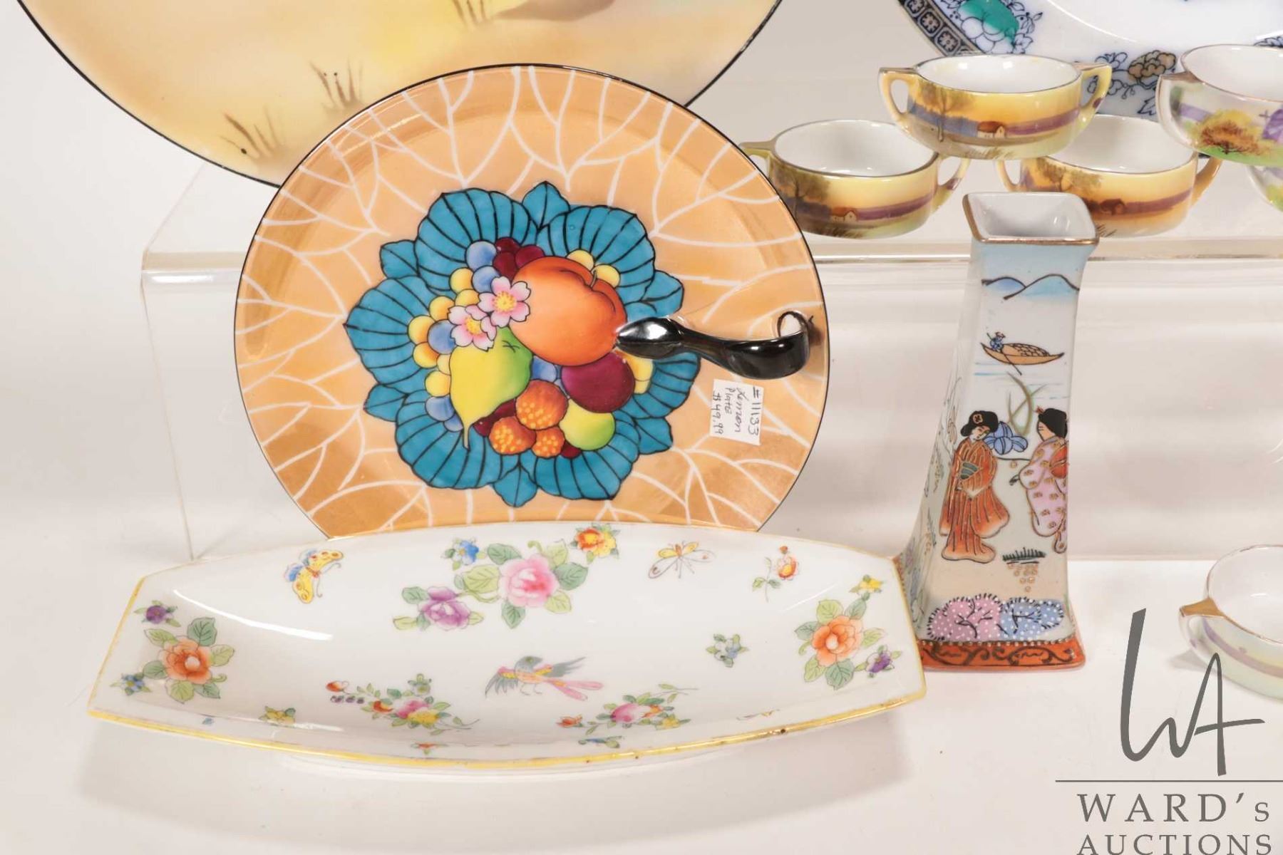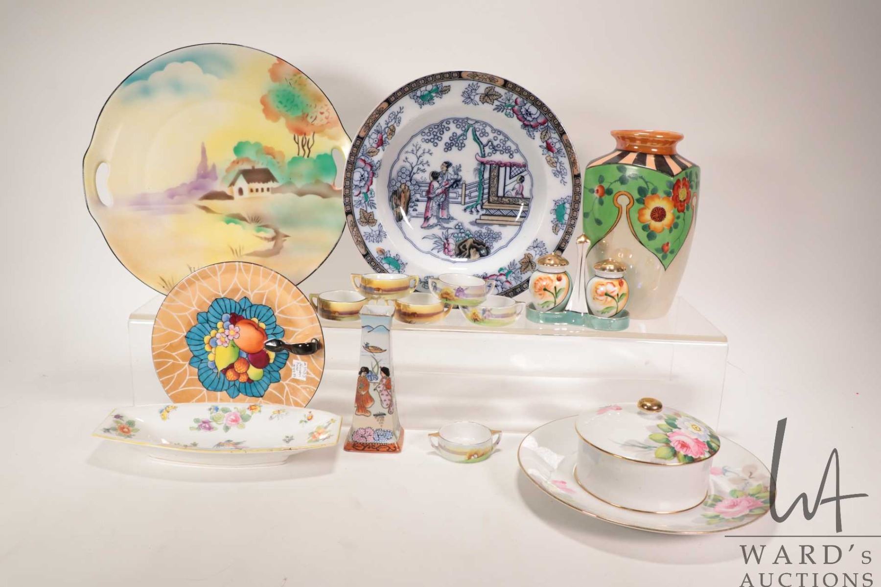 Selection of porcelain collectibles including Noritake lustre salt and pepper on stand, Nippon open salts, Noritake lustre handled dish, Hope & Carter Chinoserie bowl etc. Note: Not available for shipping. Local pickup only
