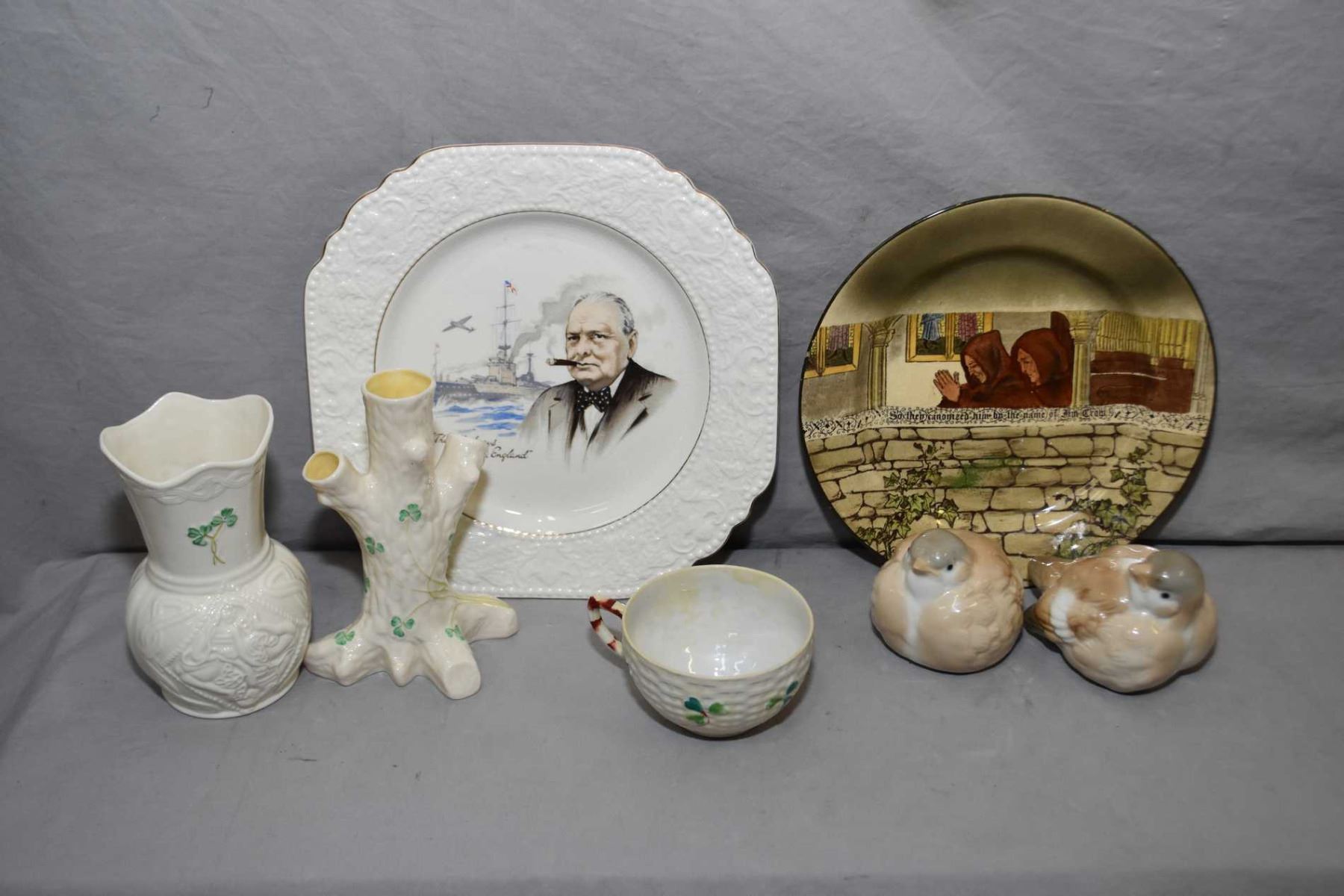 Selection of porcelain collectibles including two Belleek vases, one green mark, one black mark, Royal Doulton plate, Churchill plate, two chucky birds and a Belleek tea cups