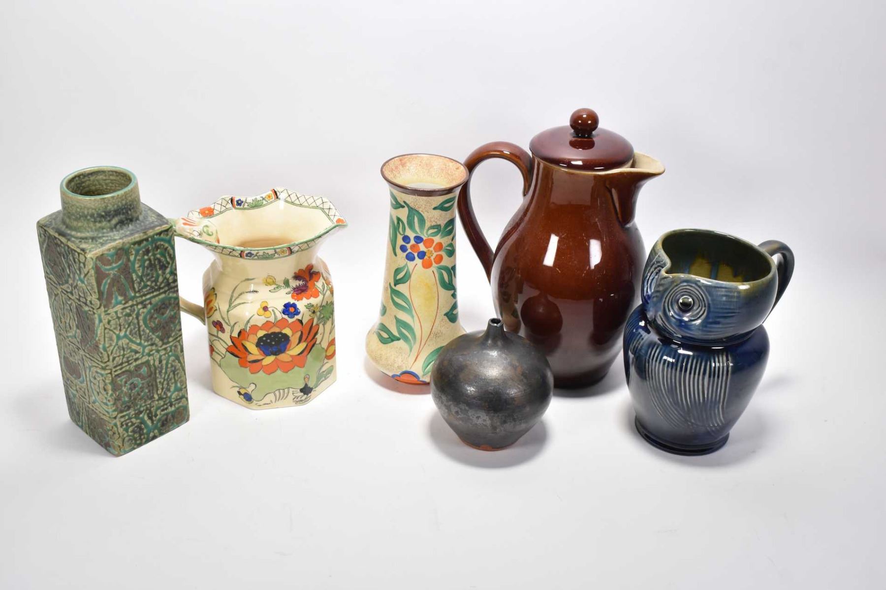 Selection of pottery and stoneware collectibles including a Denby owl pitcher, Denby, tea pot, Mason's hand painted jug, Raku ornament, Danish vase etc. Not Available For Shipping. Local Bidders Only
