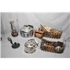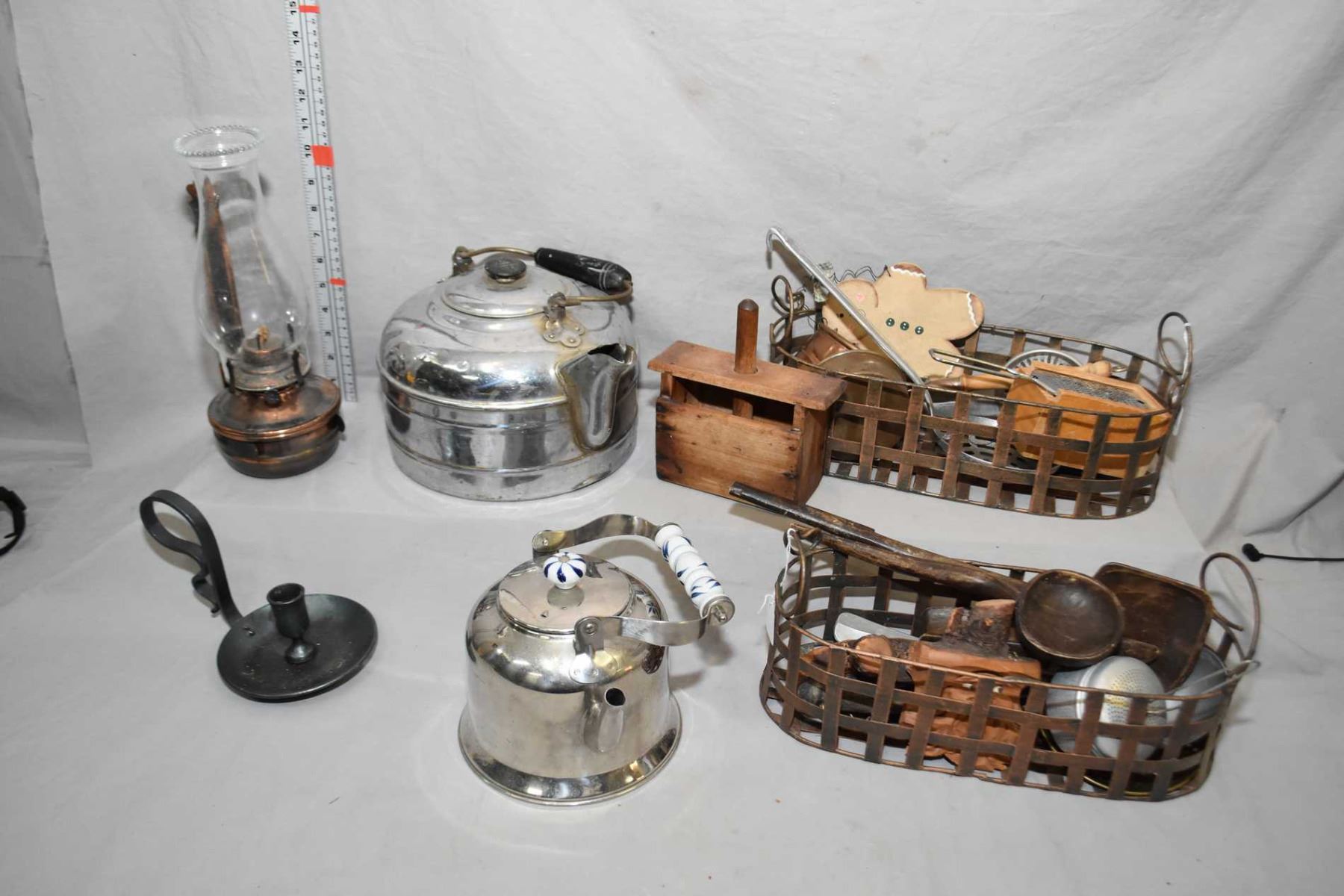 Selection of primitive and collectibles kitchenware including two kettles, wooden and metal spoons and scoops, nutmeg grater, copper ladle, butter mould, wall mount kerosene lamp etc.