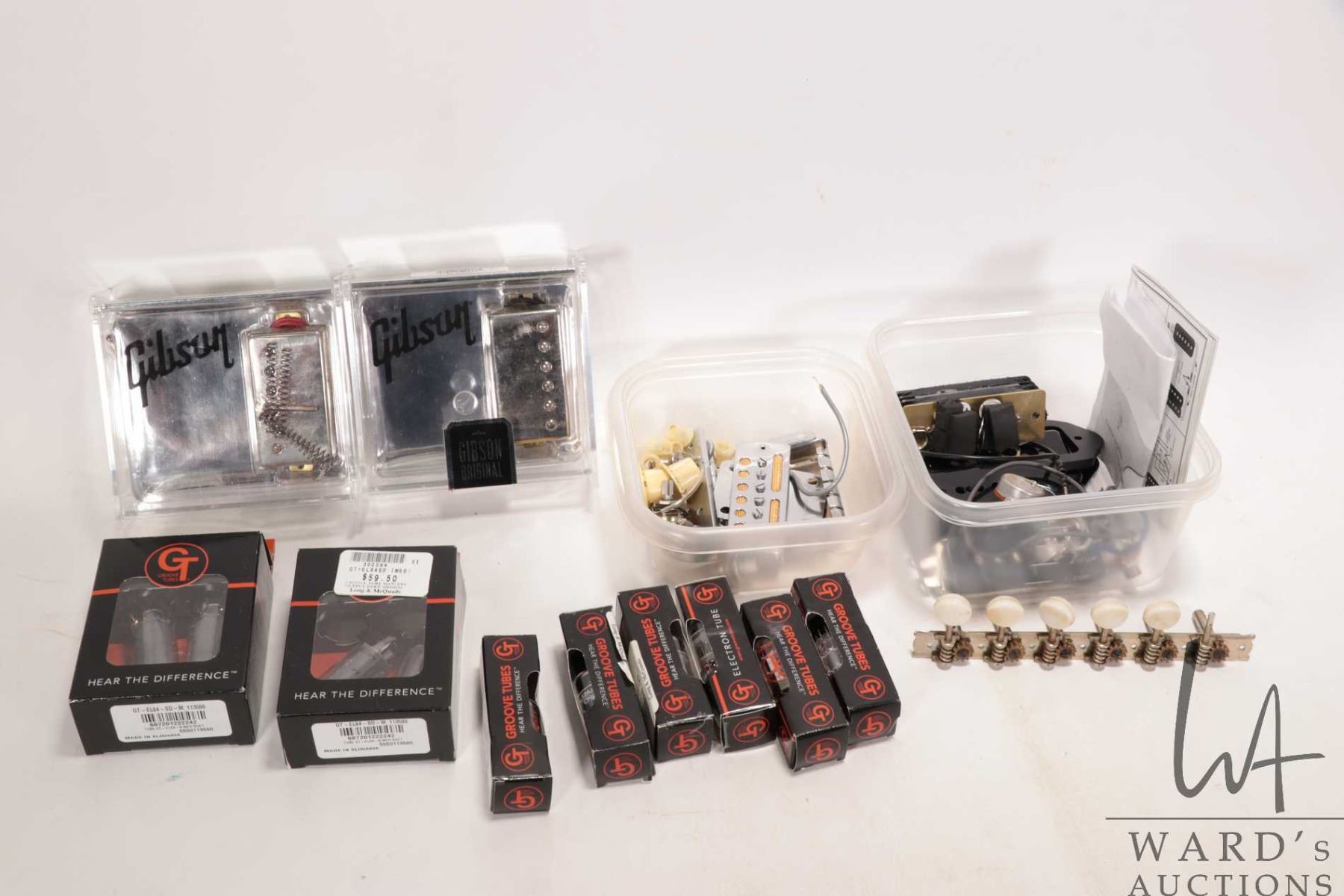 Selection of replacement guitar and amplifier parts including two picks up in Gibson boxes, both appear used and a selection of electron tubes etc.