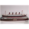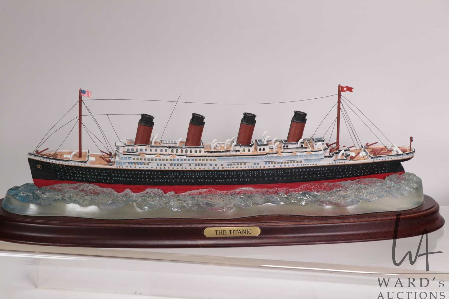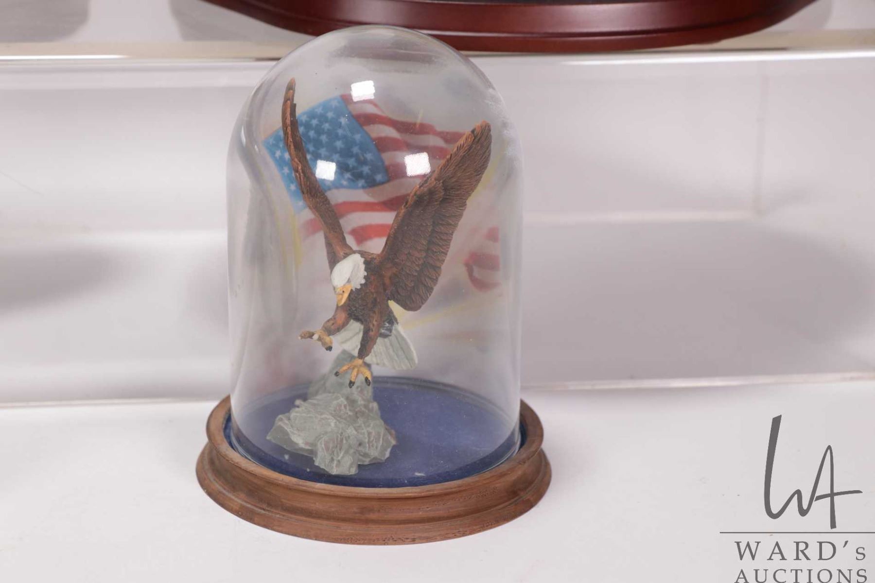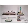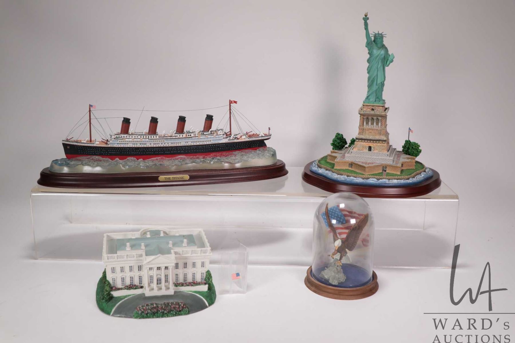 Selection of resin United States themed statues including White House, Statue of Liberty and a Titanic ship, all made by Danbury plus an American eagle under bell cloche