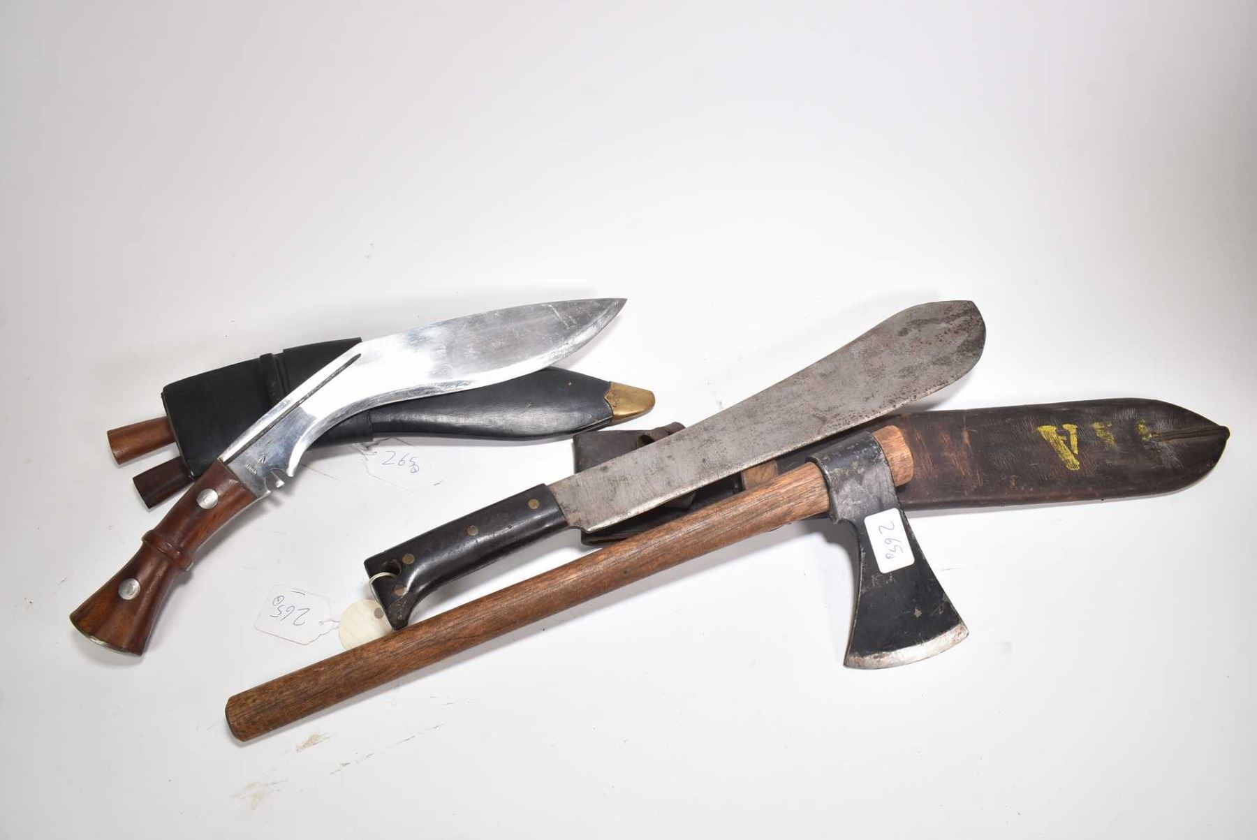 Selection of sharps including vintage Collins no. 1250 bush knife with 15" blade and leather scabbard, an unmarked tomahawk and a Kukri with scabbard