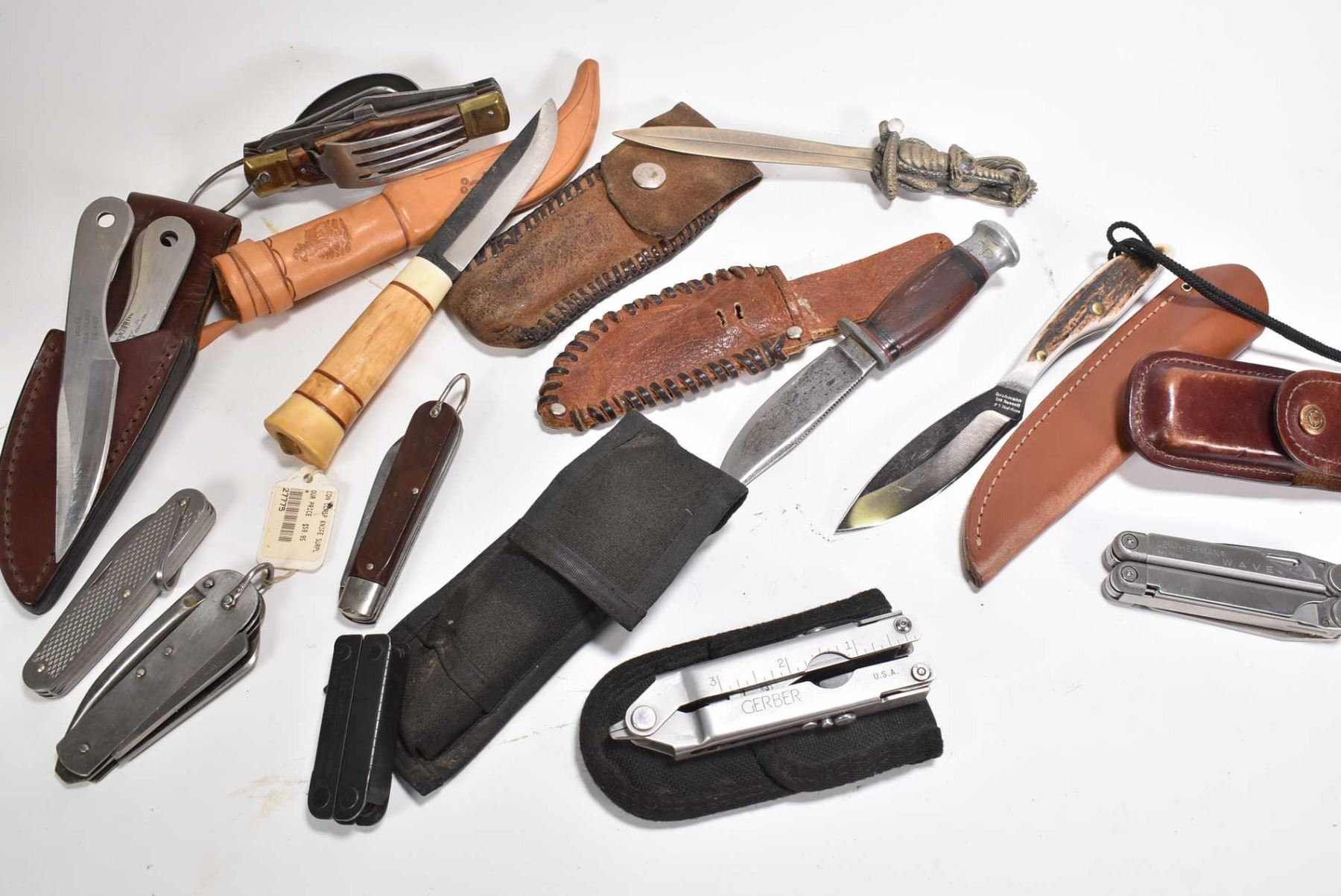 Selection of sharps including vintage survival knife, fixed blade sheath knives, multi-tool etc. plus a mini Maglite AA ( not tested) etc.