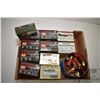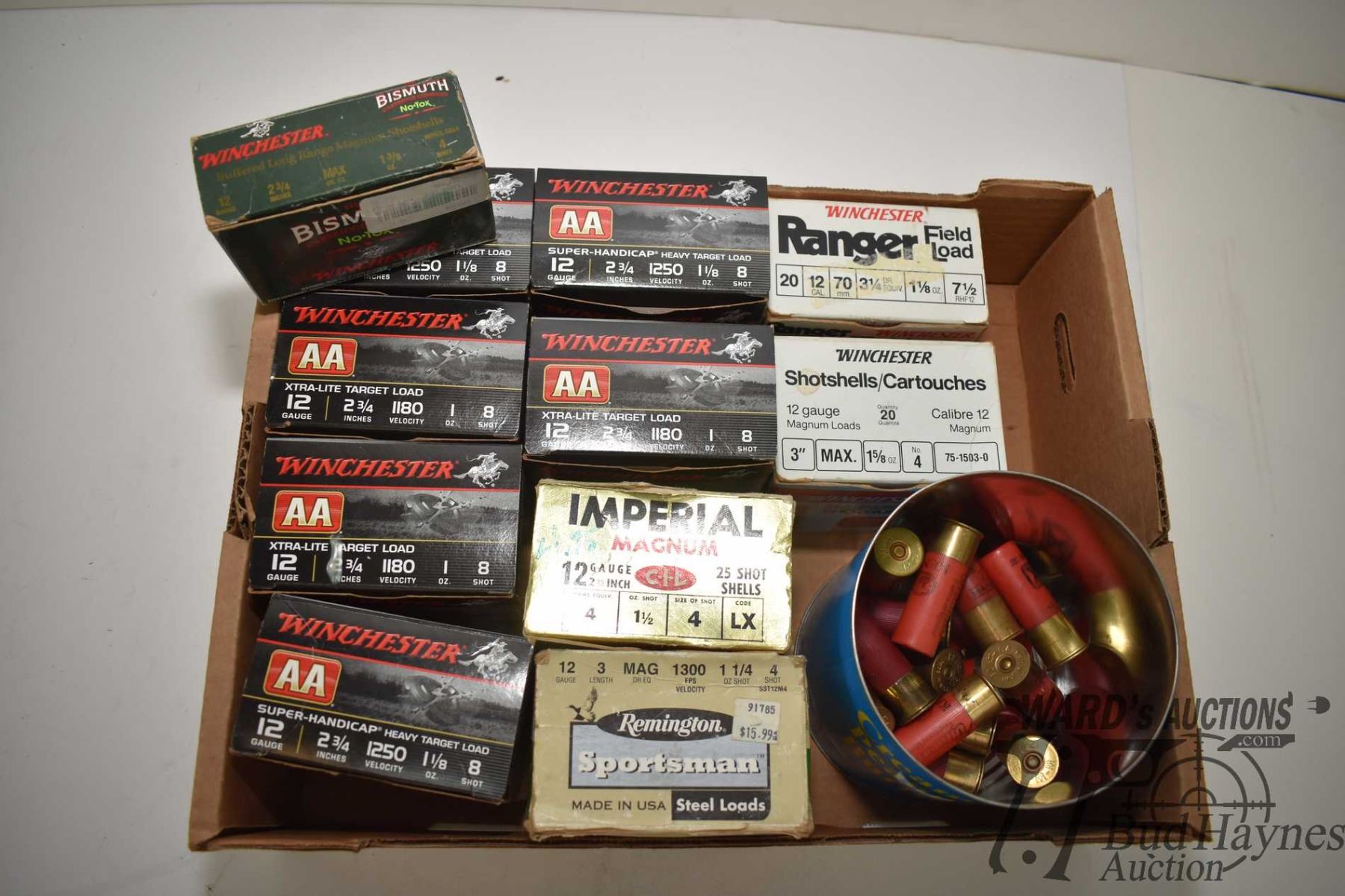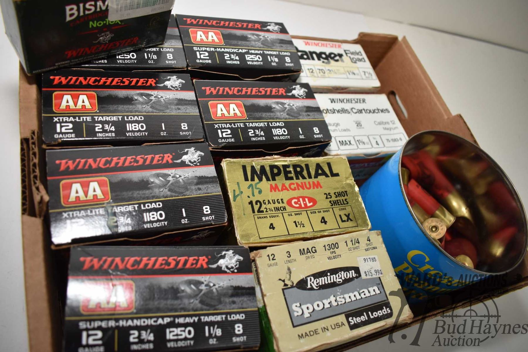 Selection of shotgun ammo including five 25 count boxes and one 11 count box of Winchester 12 GA 2 3/4" #8, one 25 count box of mixed makers 12 GA #4, one 14 count box of 12 GA 3" #4 mixed makers, one 20 count box of 12 GA 3" #4 and a 12 count box of 12 GA 2 3/4" #7 1/2. Plus a metal tin w/ 17 #4 and 4 #2 and box w/ 6 12 GA 2 3/4" #4