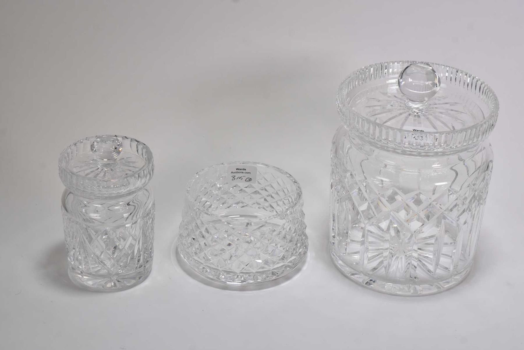 Selection of signed Waterford crystal including 6" lidded biscuit barrel, 4" lidded spooner and a small sugar bowl