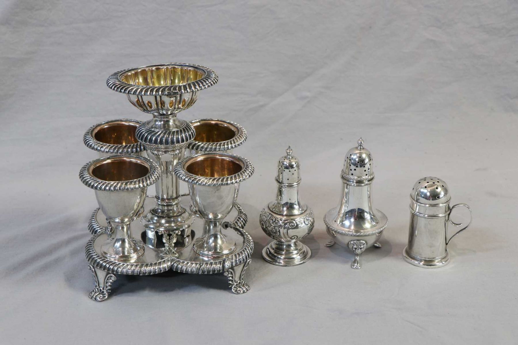 Selection of silver including sterling shakers and a four cup silver-plate egg holder