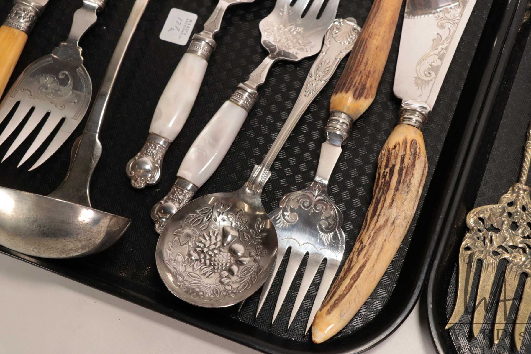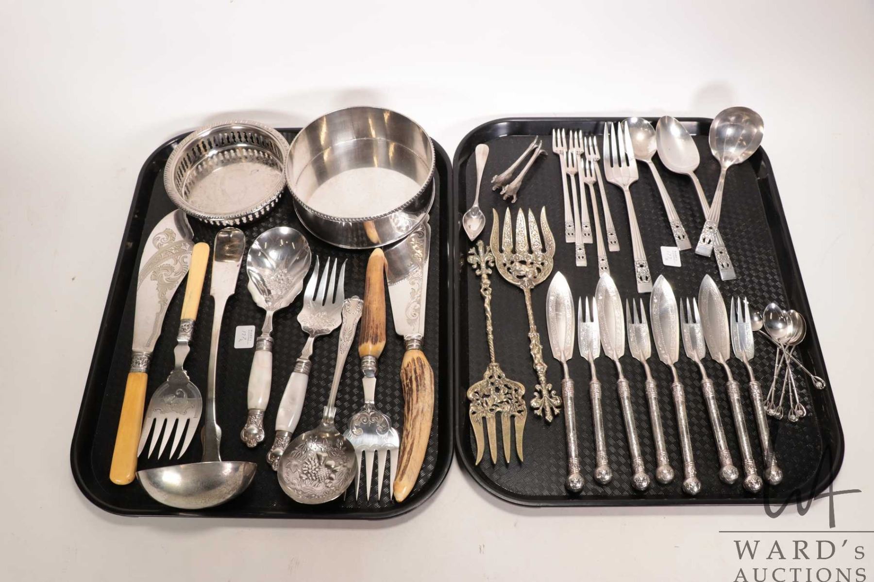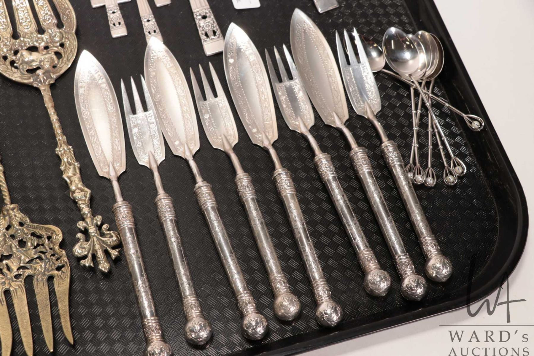 Selection of silver plate flatware and serving utensils including two sets of fish serving pieces, f