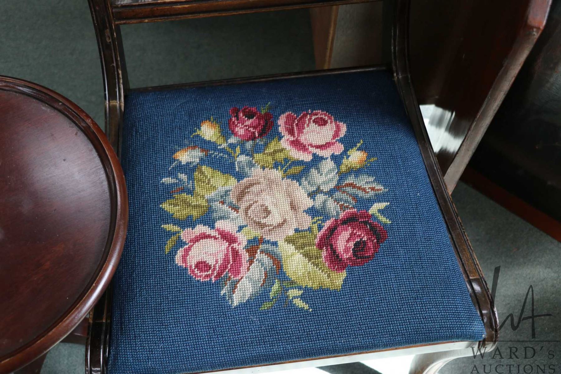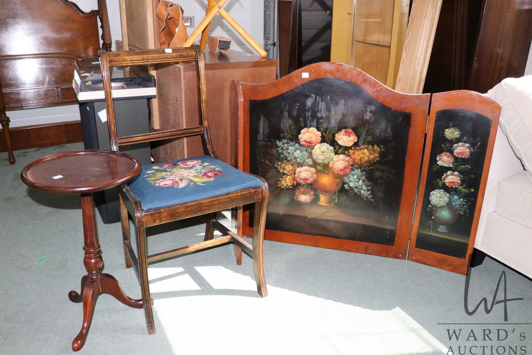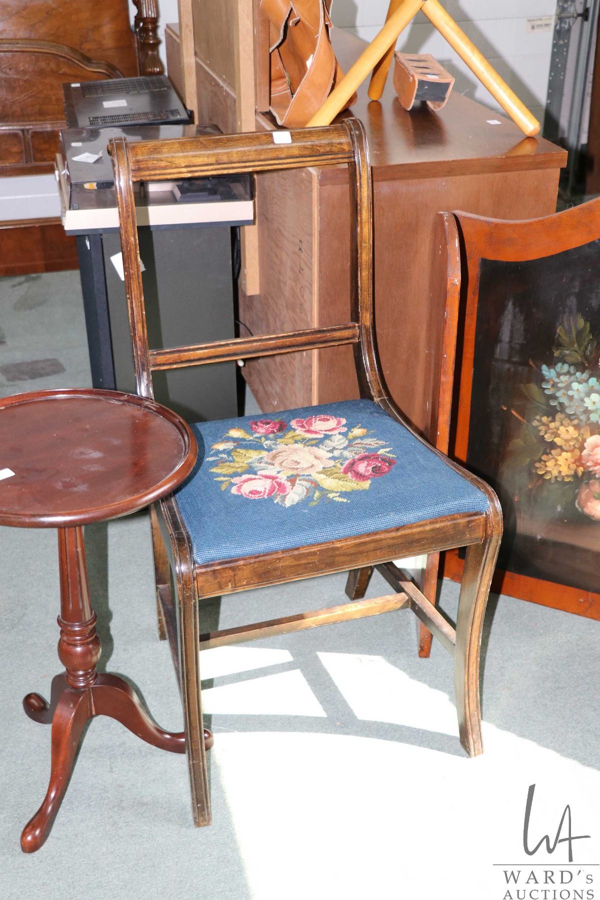 Selection of small furnishing including Gibbard mahogany 22" X 14" D wine table, Duncan Fyfe dining chair with needle point upholstered seat and a floral motif fireplace screen