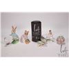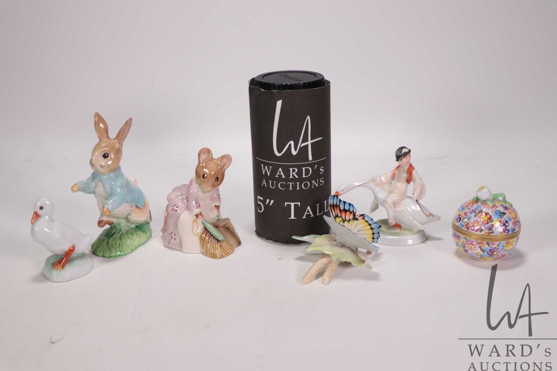 Selection of small hand painted china cabinet pieces including Beswick Beatrix Potter's "Hunca Munca Sweeping" and "Peter Rabbit", Herend Pottery boy riding a goose, small duck and pierced lidded fragrance ball, plus German pottery butterfly, all 2 1/2"- 4 1/2"