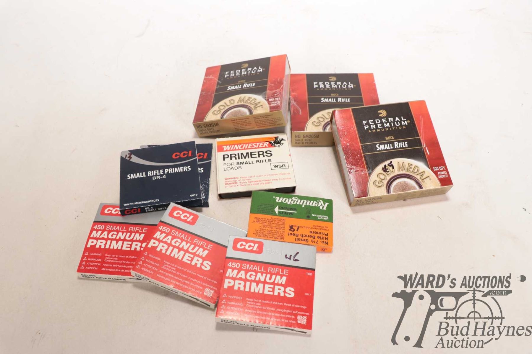 Selection of small rifle primers including 245 count Federal Premium, 246 count of CCI Magnum primers, 100 count Winchester primers, 113 count of CCI #BR.4 and 18 count Remington Bench Rest # 7 1/2"