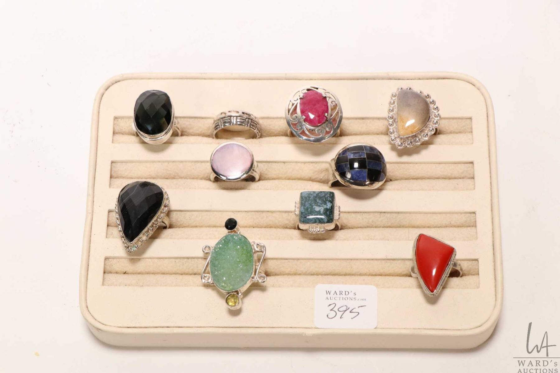 Selection of sterling silver and gemstone rings including Iolite, agate, red jasper, cherry ruby etc.