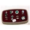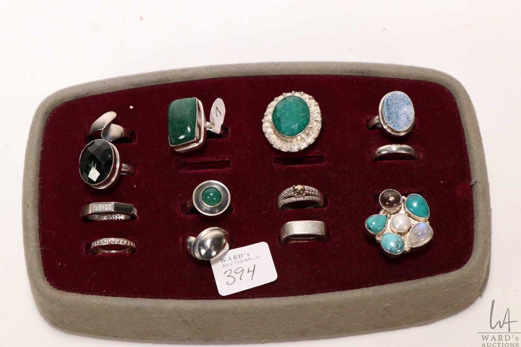 Selection of sterling silver and gemstone rings including jade, pearl, Iolite, turquoise etc.