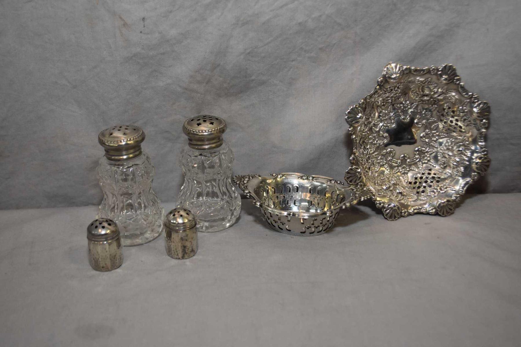 Selection of sterling silver including British hallmarked pierced dish, a pair of Birks sterling pierced nut dishes, crystal shakers with sterling tops and a pair of small sterling shakers