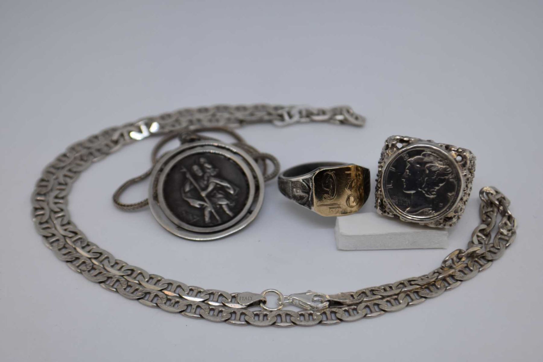 Selection of sterling silver including gent's rings, curb chain and a St. Christopher pendant and chain