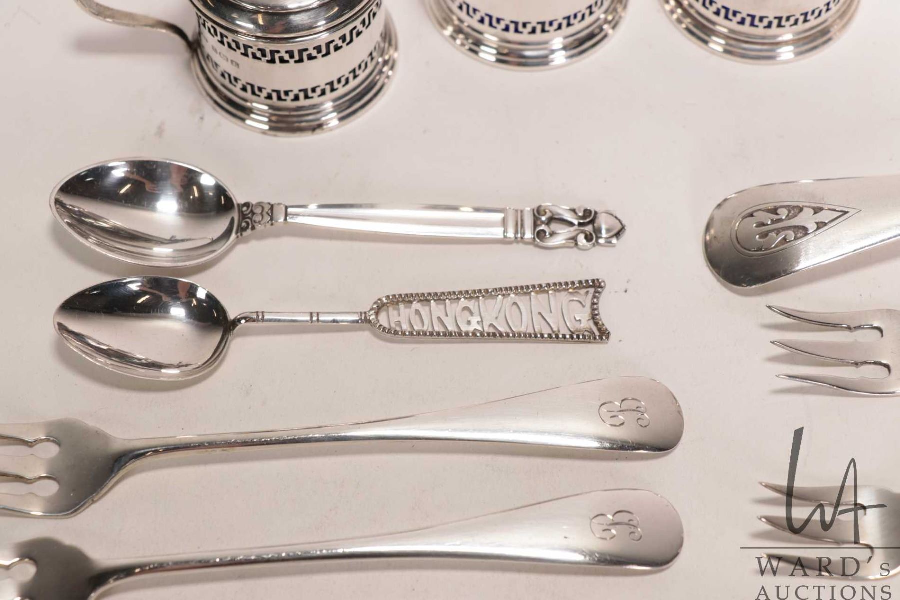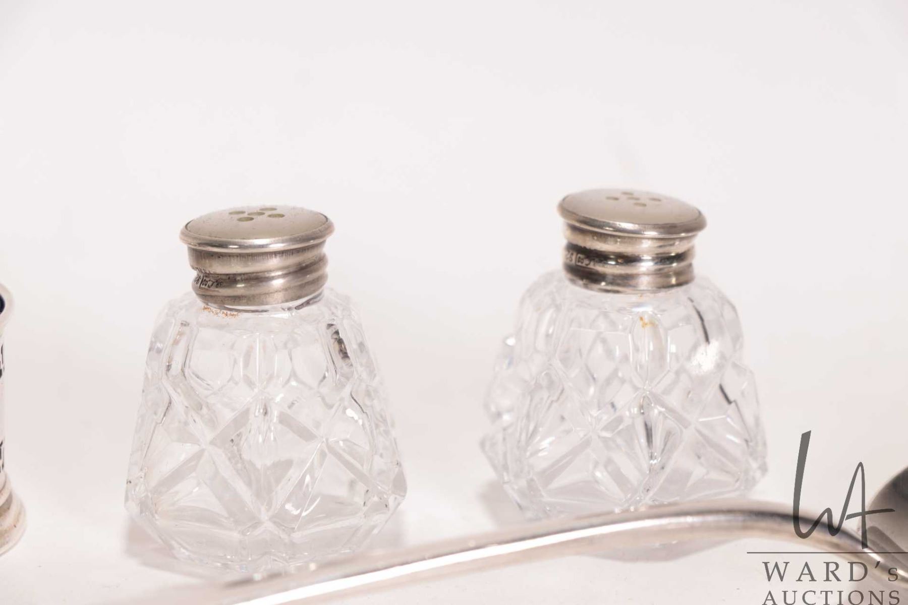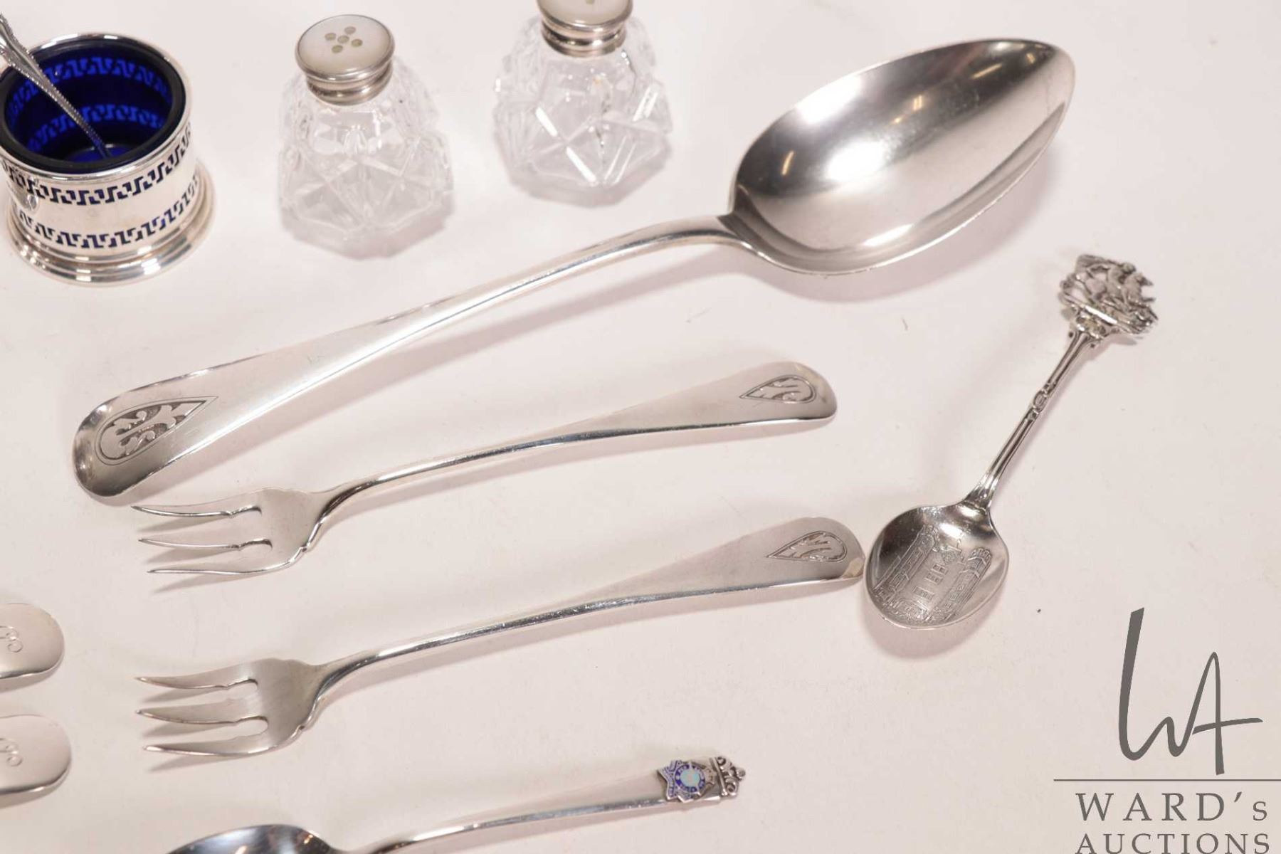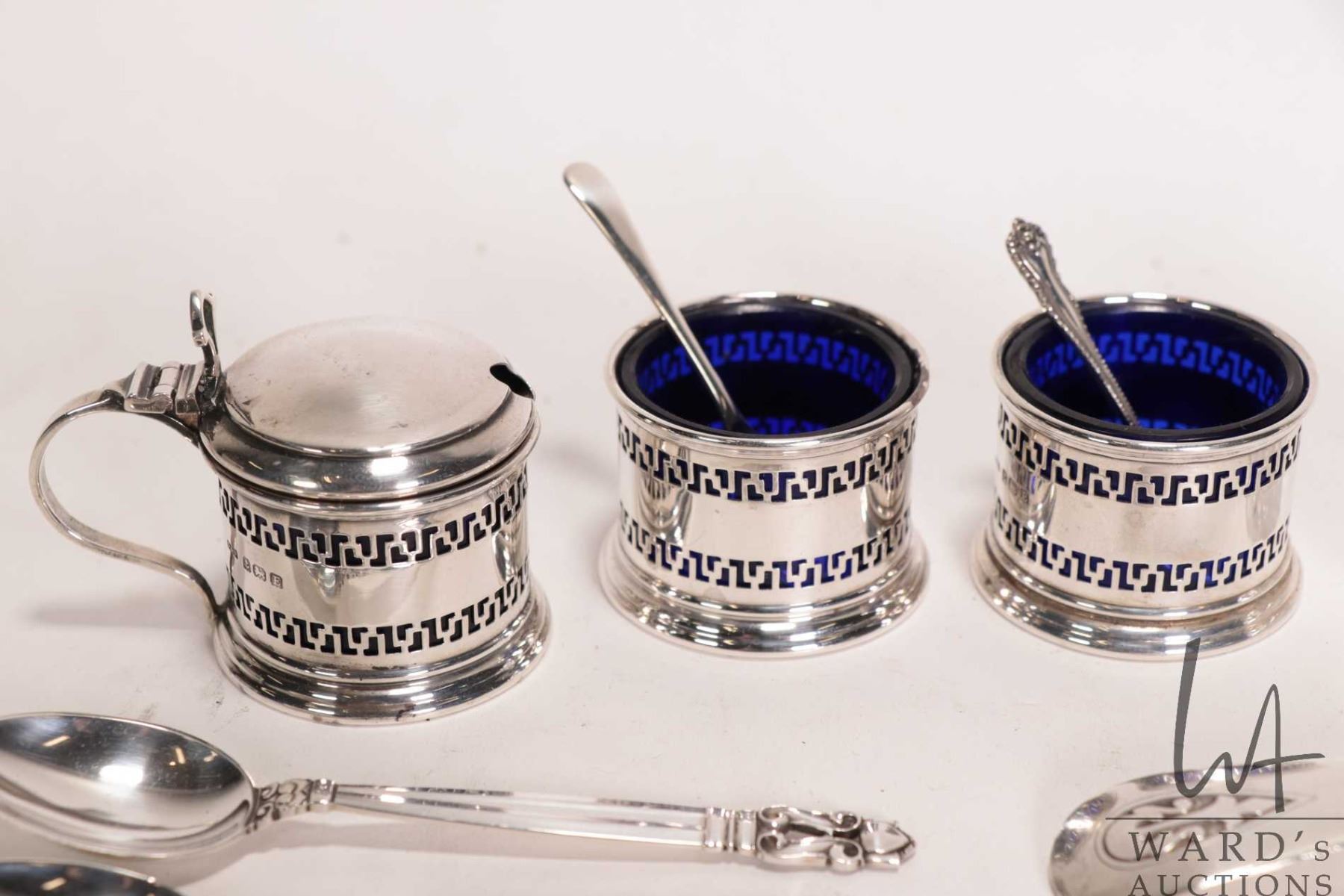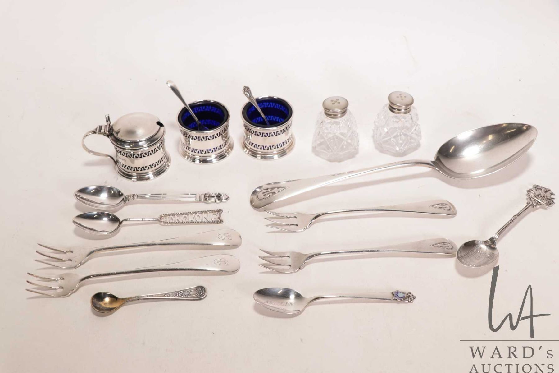 Selection of sterling silver including large sterling silver serving spoons, two open salts and a mustard pot with cobalt glass liners, four pickle forks, five spoons including salt spoons and a pair of shakers with sterling silver and mother-of-pearl tops