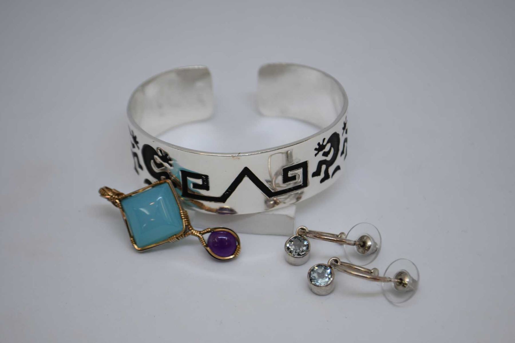 Selection of sterling silver jewellery including a blue chalcedony and cabochon purple amber pendant wrapped in 14kt gold plated wire, a pair of round blue topaz earrings and a sterling native Hopi design sterling cuff