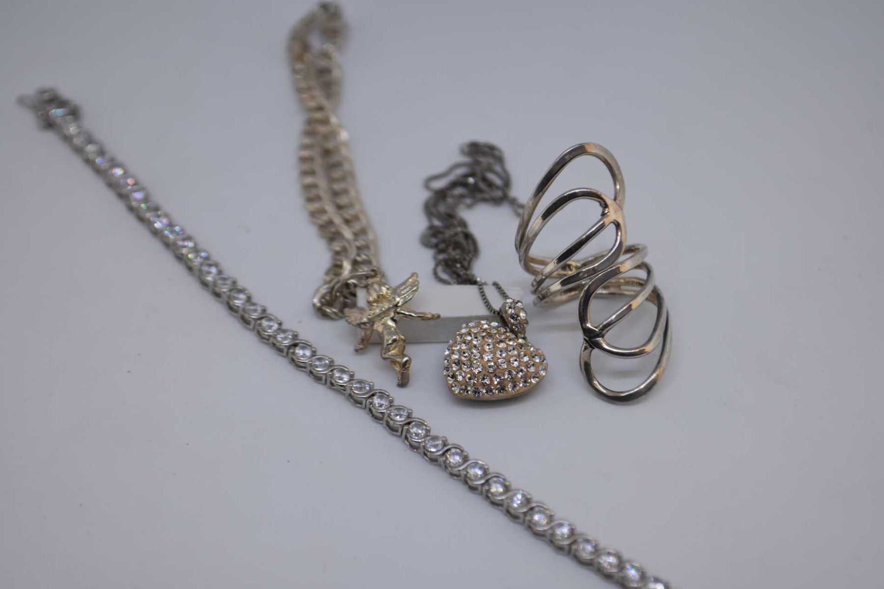 Selection of sterling silver jewellery including diamante tennis bracelet and heart shaped pendant on neck chain, bracelet with angel chair and a stylized sterling ring