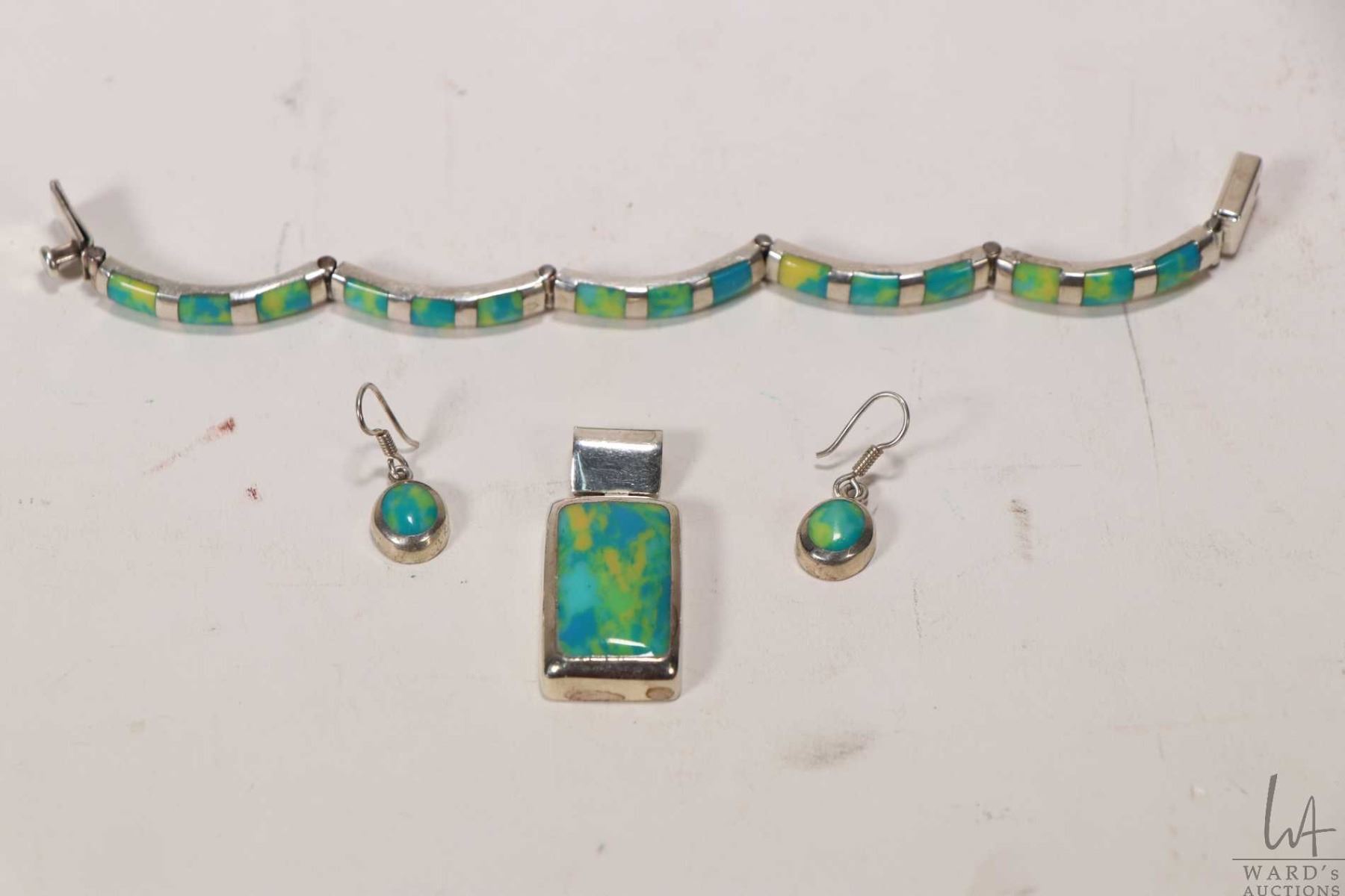 Selection of sterling silver jewellery including earrings, bracelet and pendant, all matching