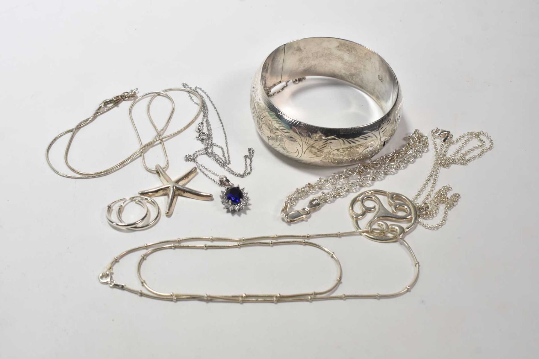 Selection of sterling silver jewellery including gemstone style pendant and chain, starfish pendant and chain, stylized pendant and chain, a necklace with tiny silver beads and a linked bracelet plus a heavily chaised hinged bracelet