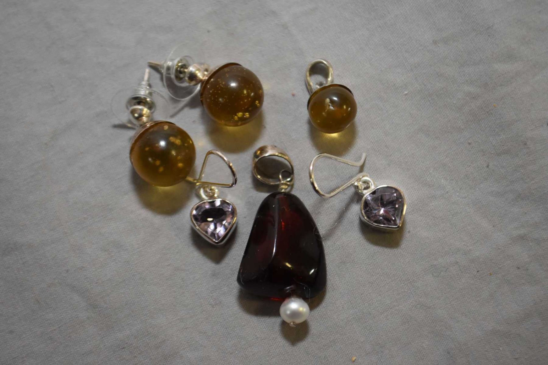Selection of sterling silver jewellery including golden amber sphere pendant and matching earrings, amethyst heart shaped earrings and a red cherry amber pendant set with genuine pearl
