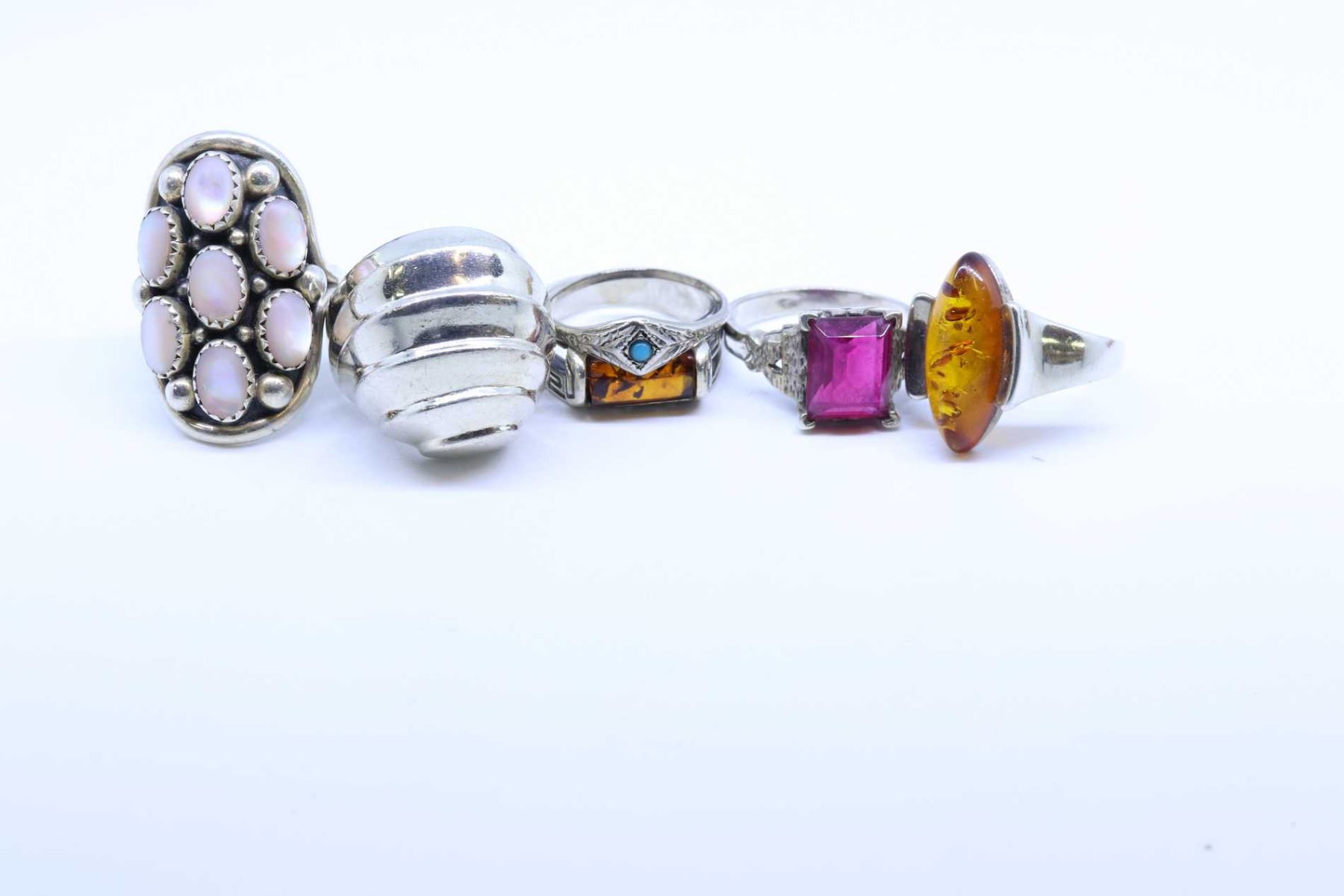 Selection of sterling silver rings including vintage amber rings, gemstone set rings plus an unmarked ring with blue gemstone
