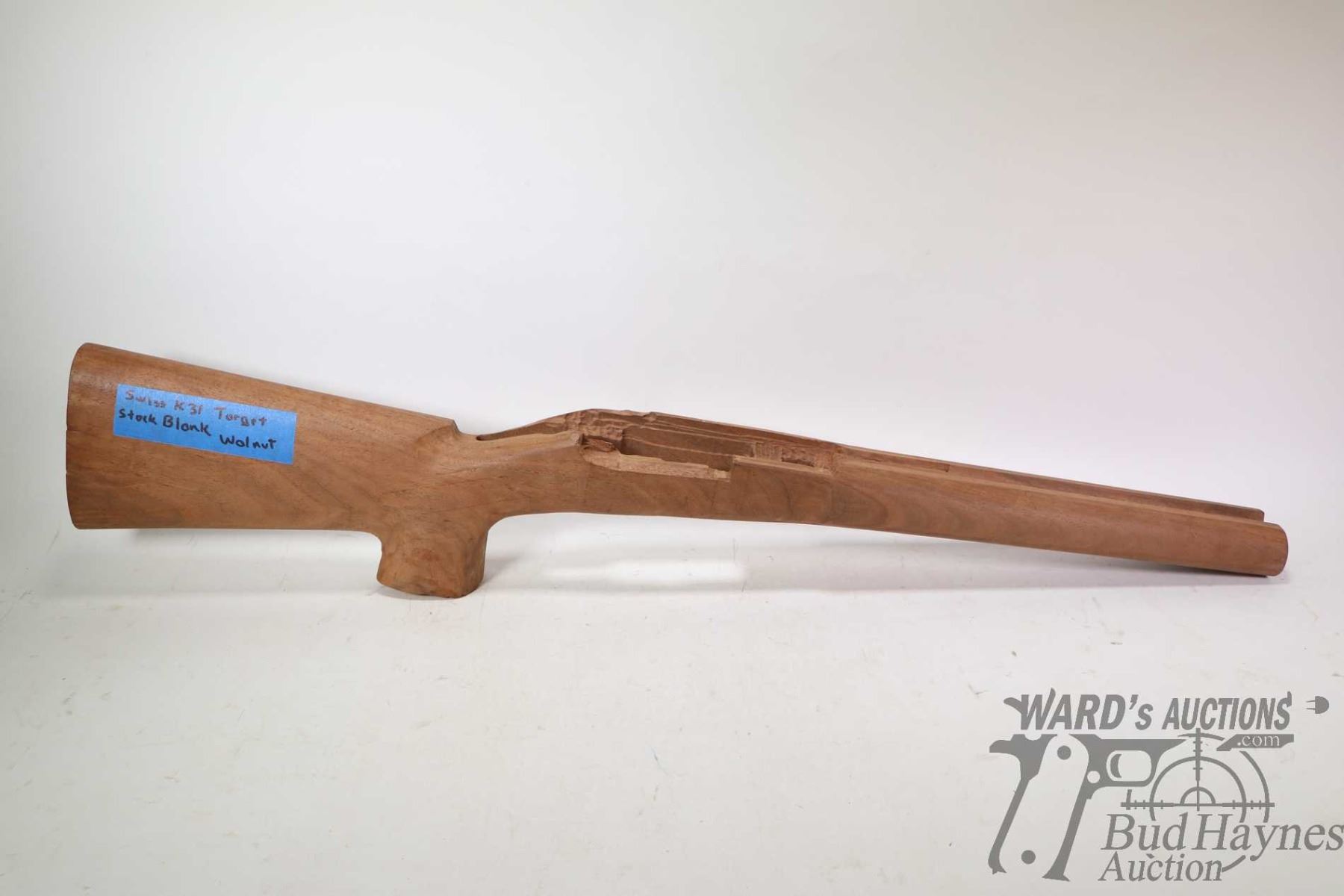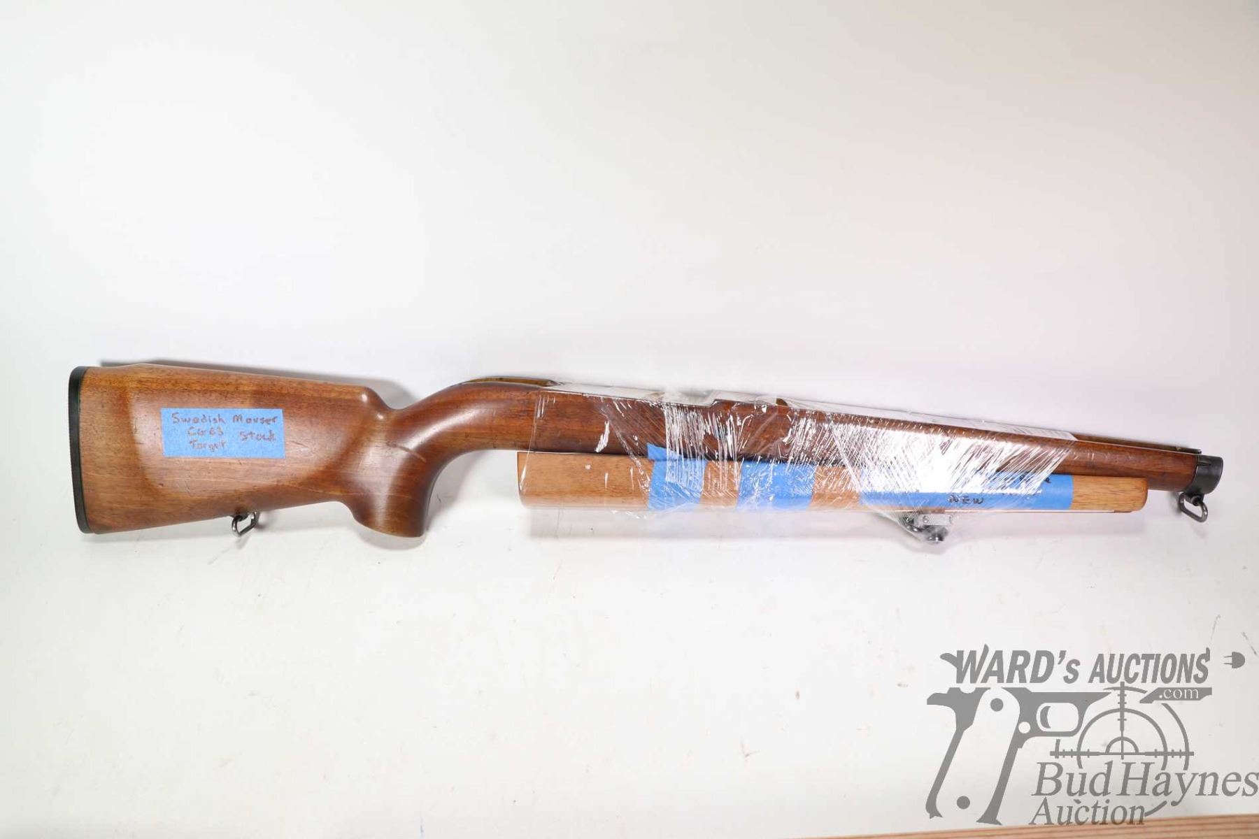 Selection of stocks including used Swedish Mauser CG 63 target stock, Bench Rest stock blank and Swedish K31 stock blank