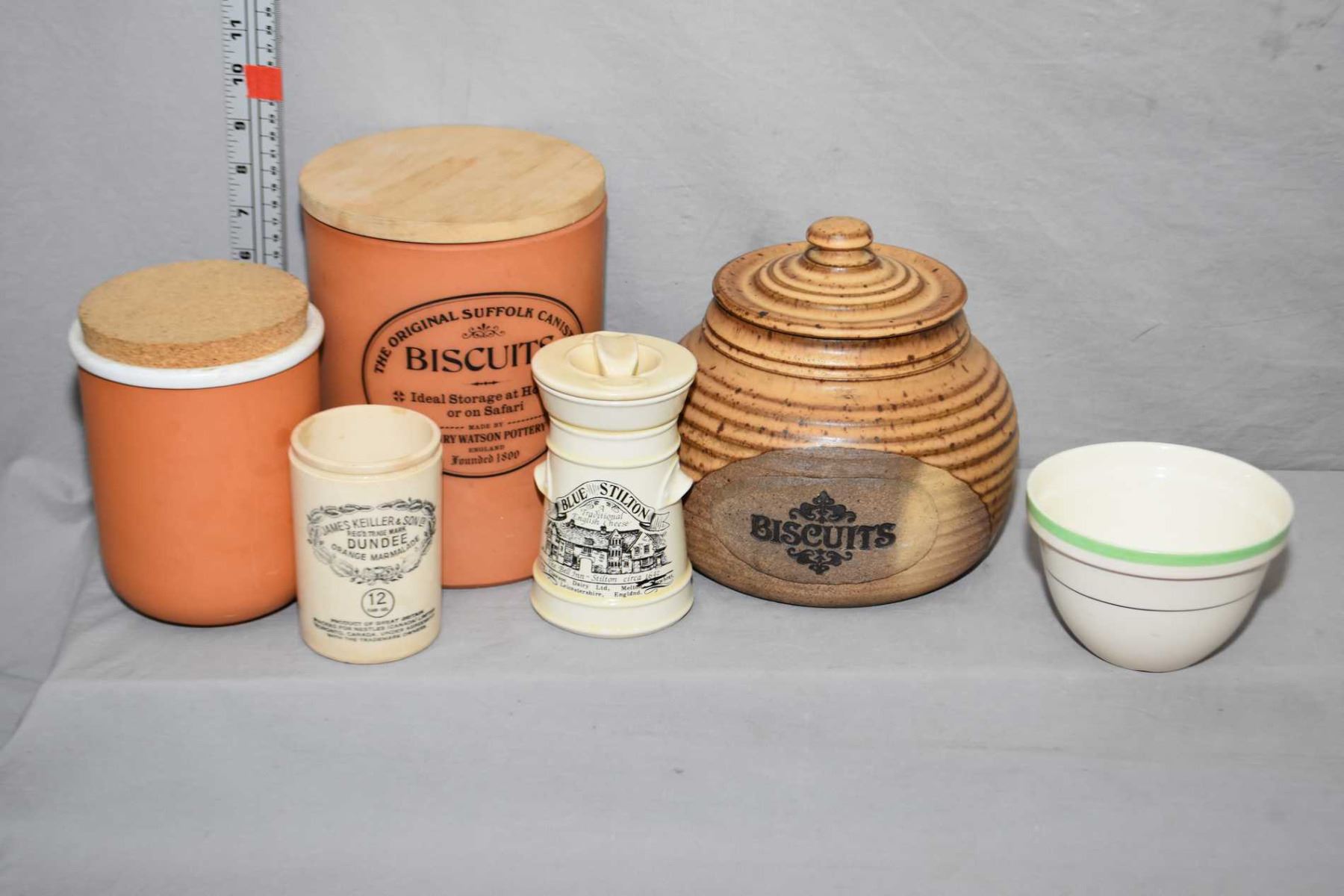Selection of stoneware and clay including biscuit barrels, stilton cheese, orange Marmalade, small pudding bowl etc.