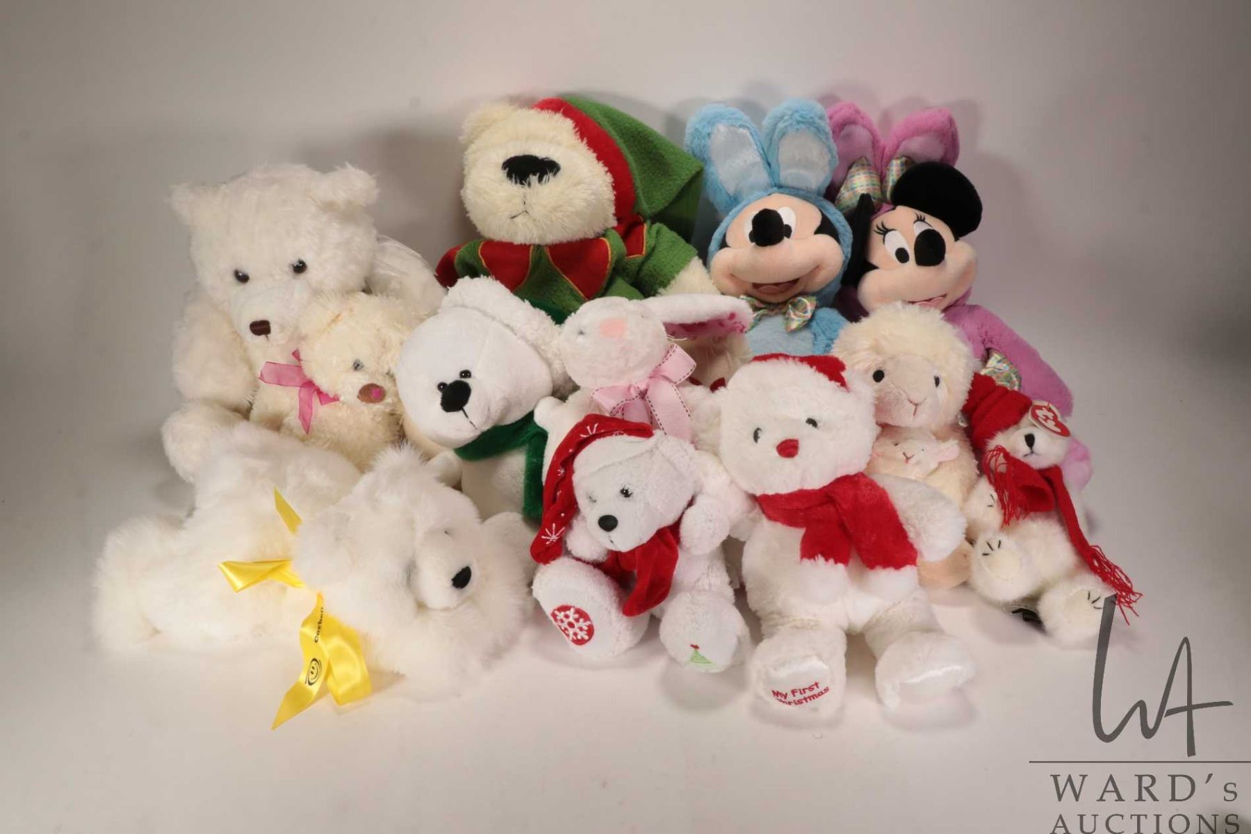 Selection of stuffed toys including Stollery, Gund, Paper Destiny, Disney Mickey and Minnie Mouse, Ty, Gund, Christmas bear etc.