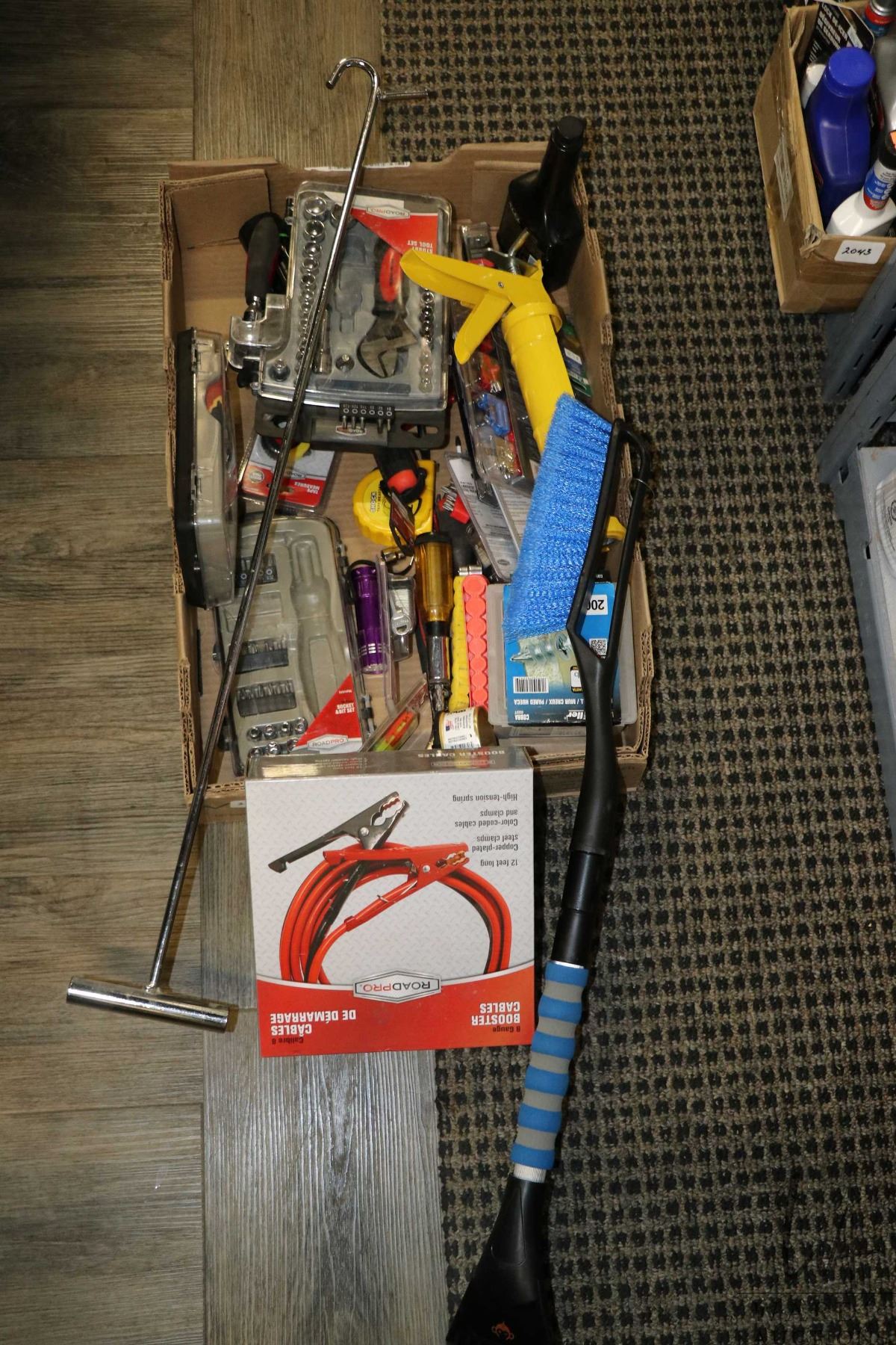 Selection of tool kits, pad lock, flash lights, Jumper cables, earphones, fifth wheel lock tool, wire connector kit, tape measures, fused caulking gun etc.