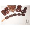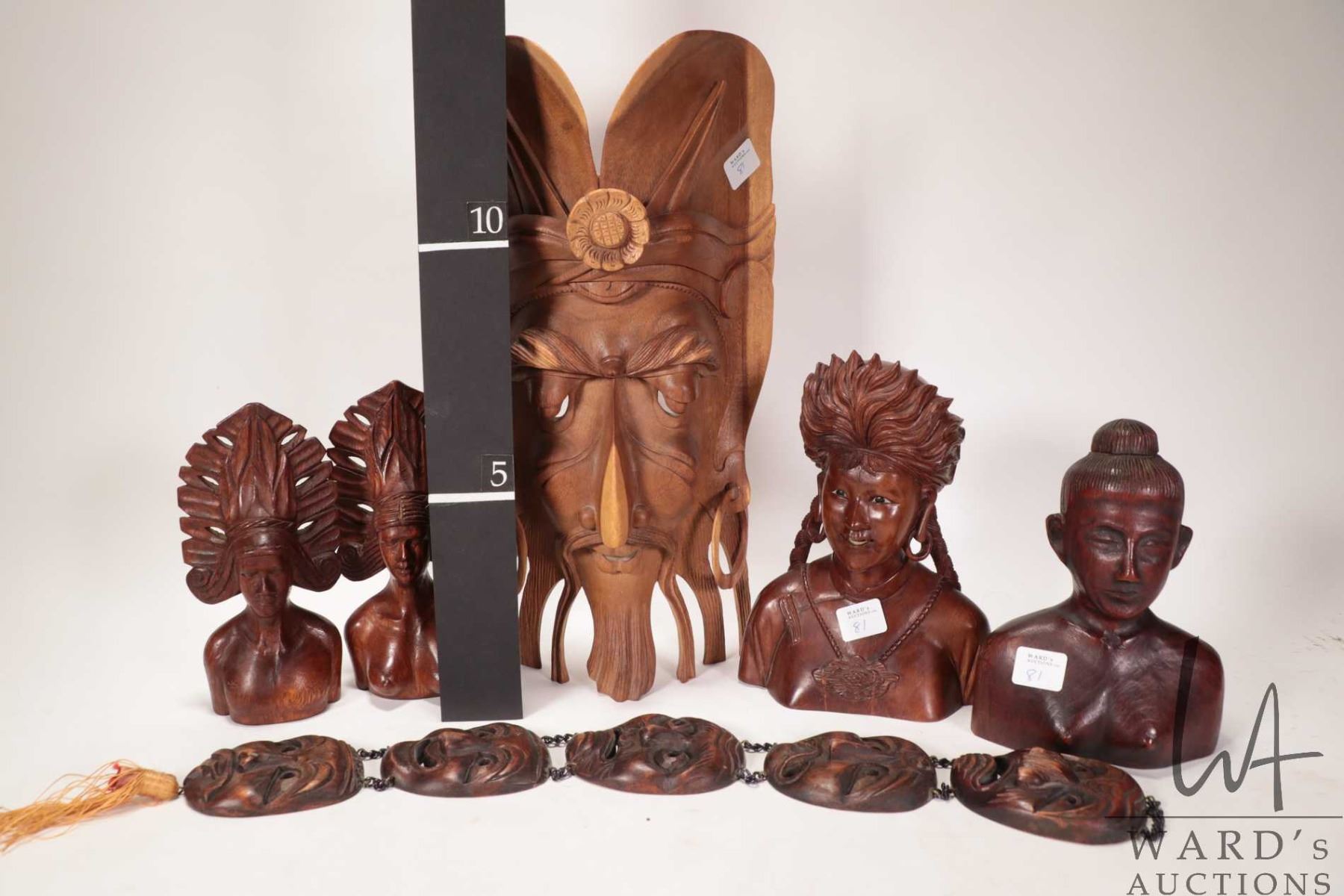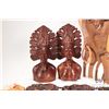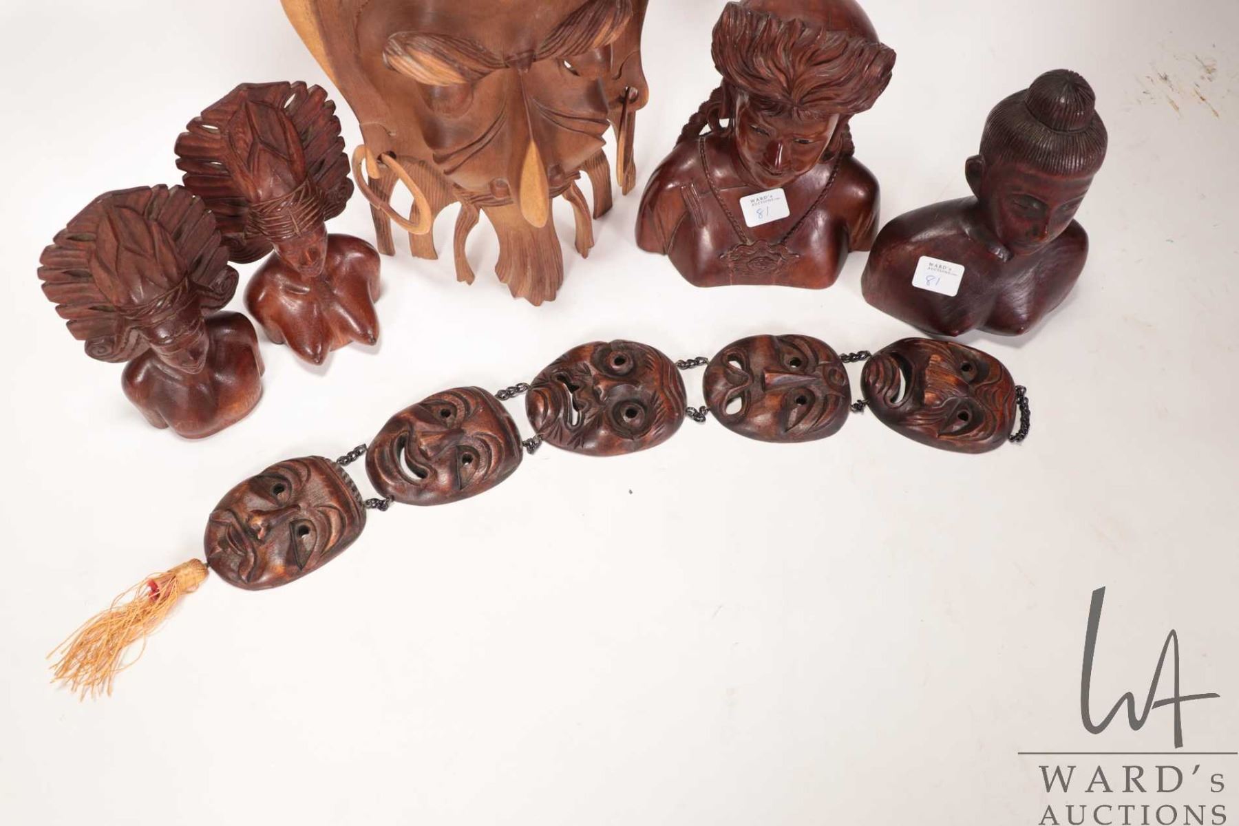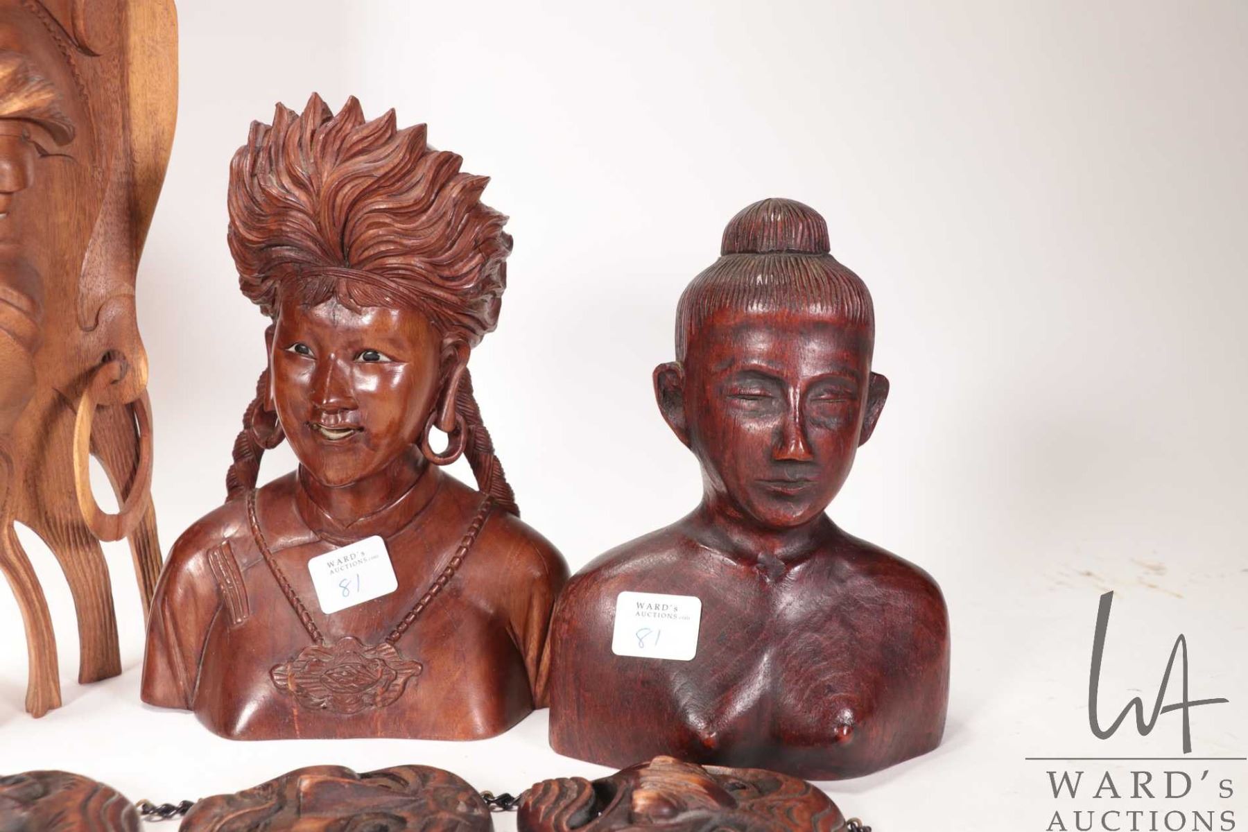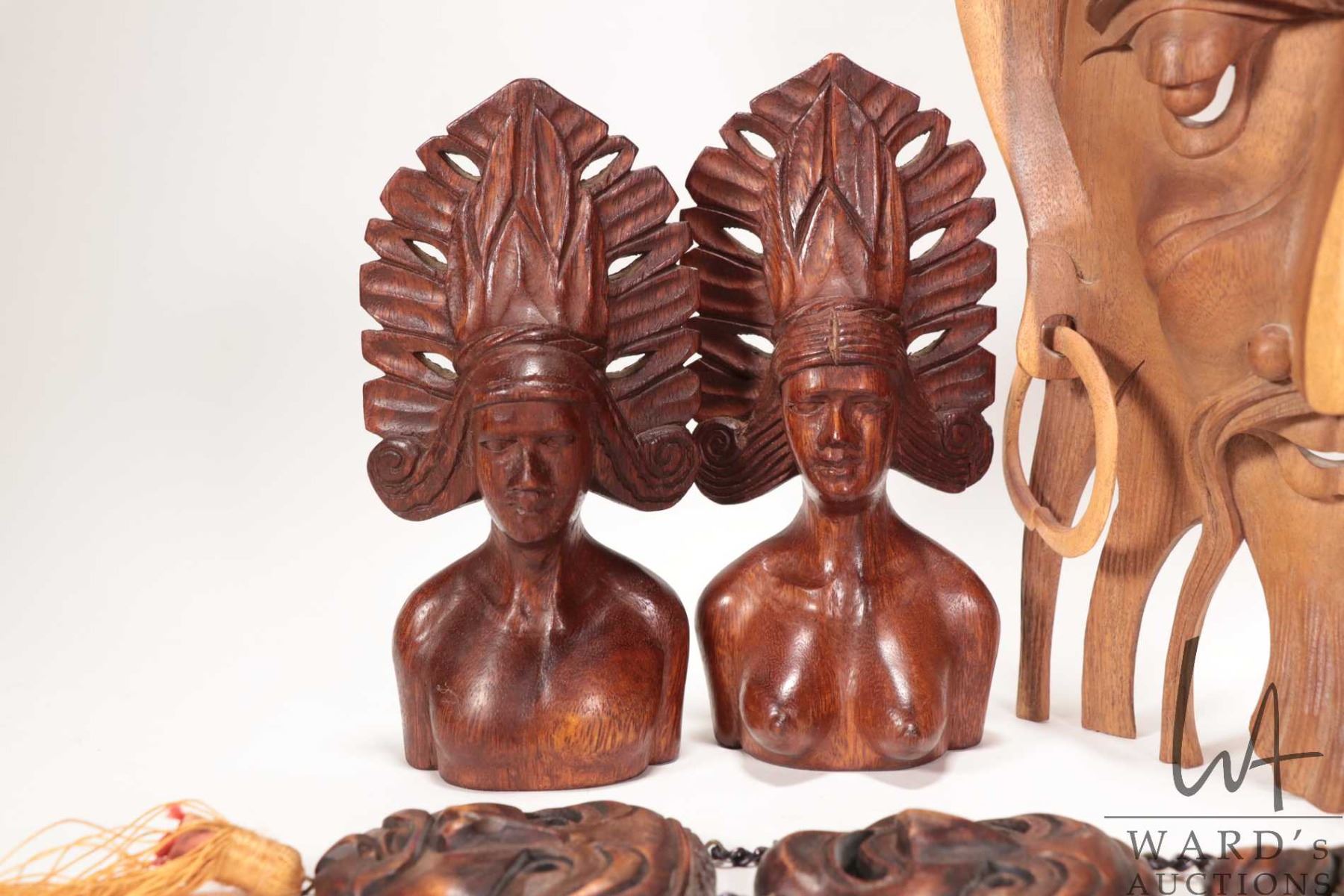 Selection of treenware including busts, 14" mask, wall hanging etc.