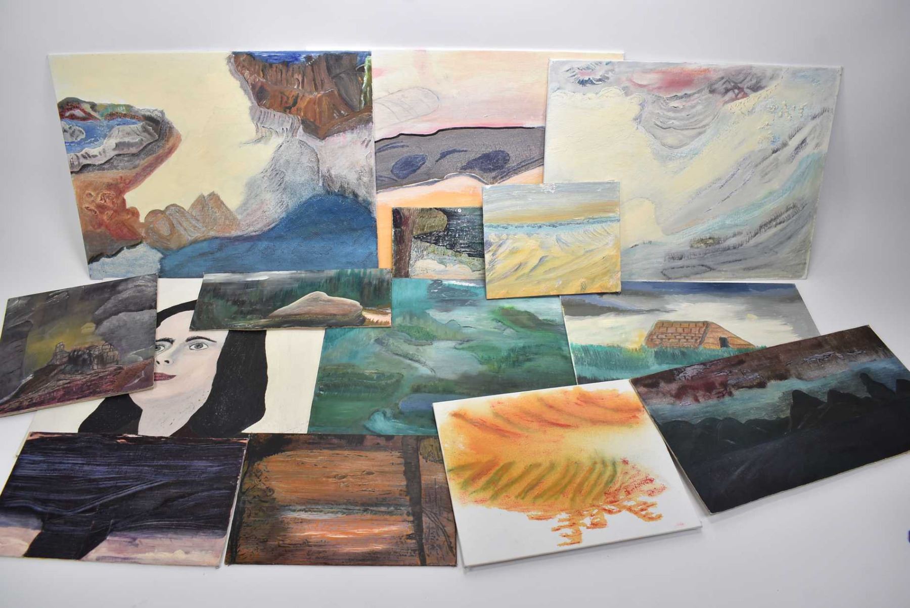 Selection of unframed original acrylic on board painting, assorted subjects and sizes