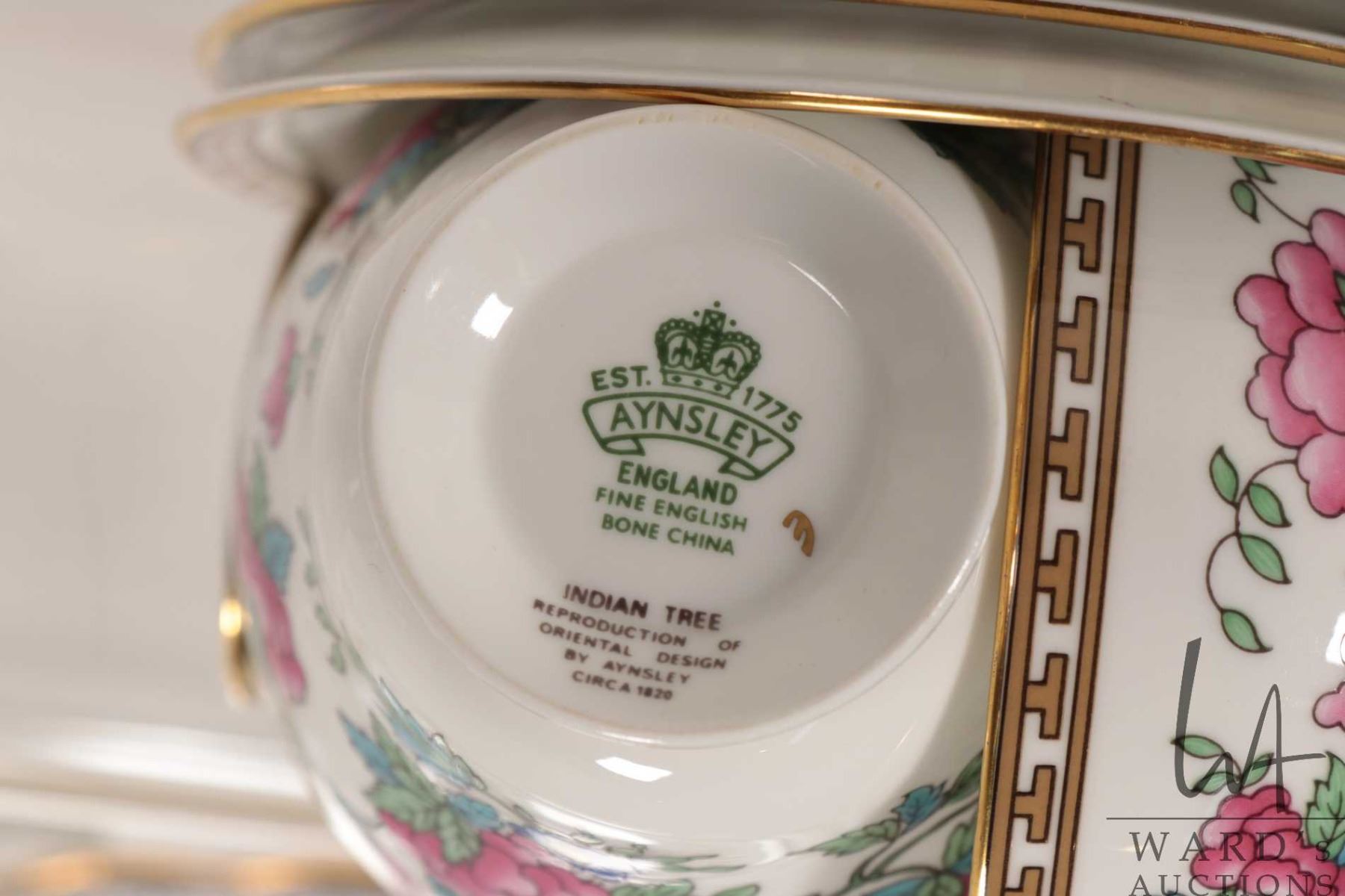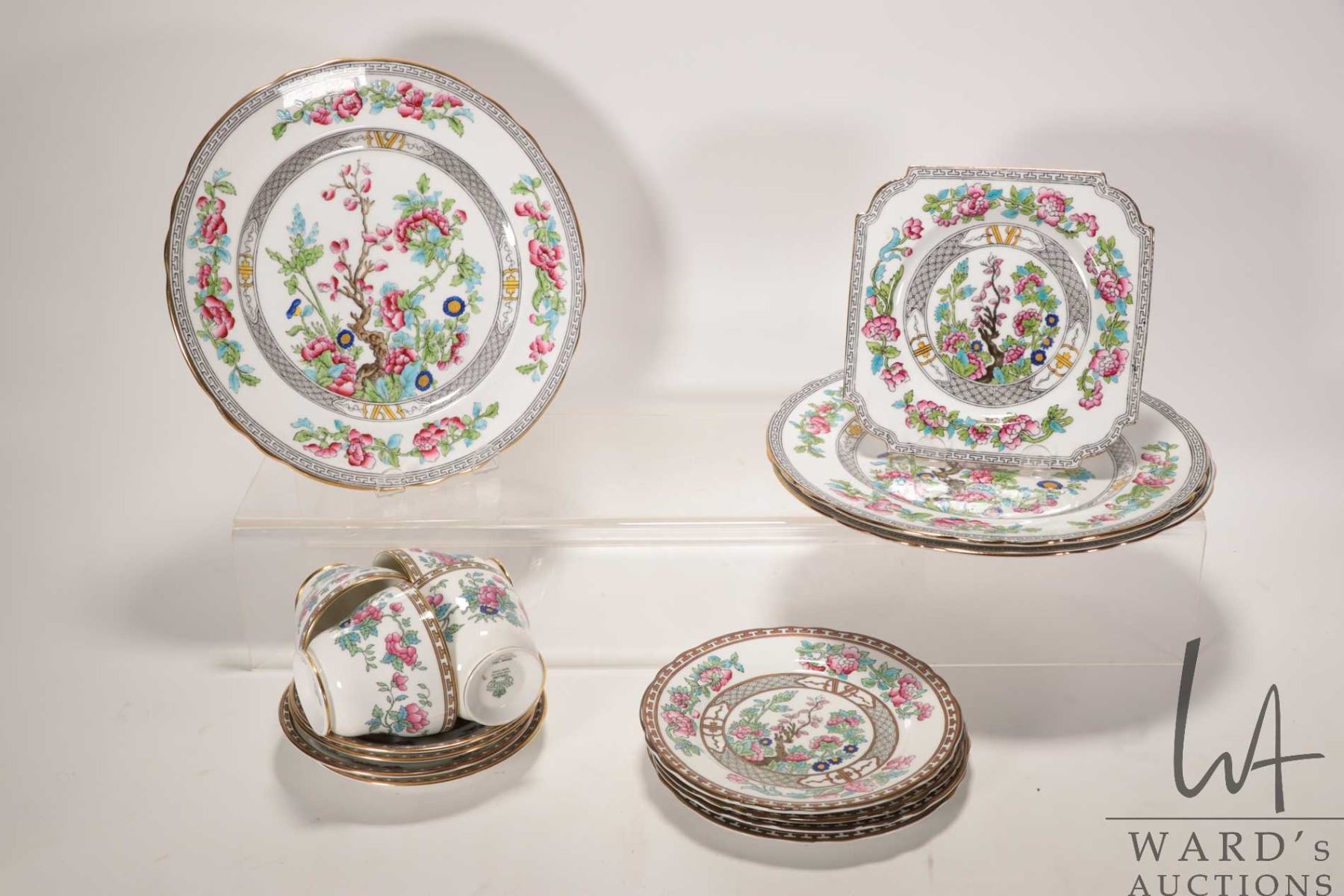Selection of vintage Aynsley Indian Tree china dinnerware including three 10" dinner plates, four 7" plates, square sandwich plate and four teacups and saucers