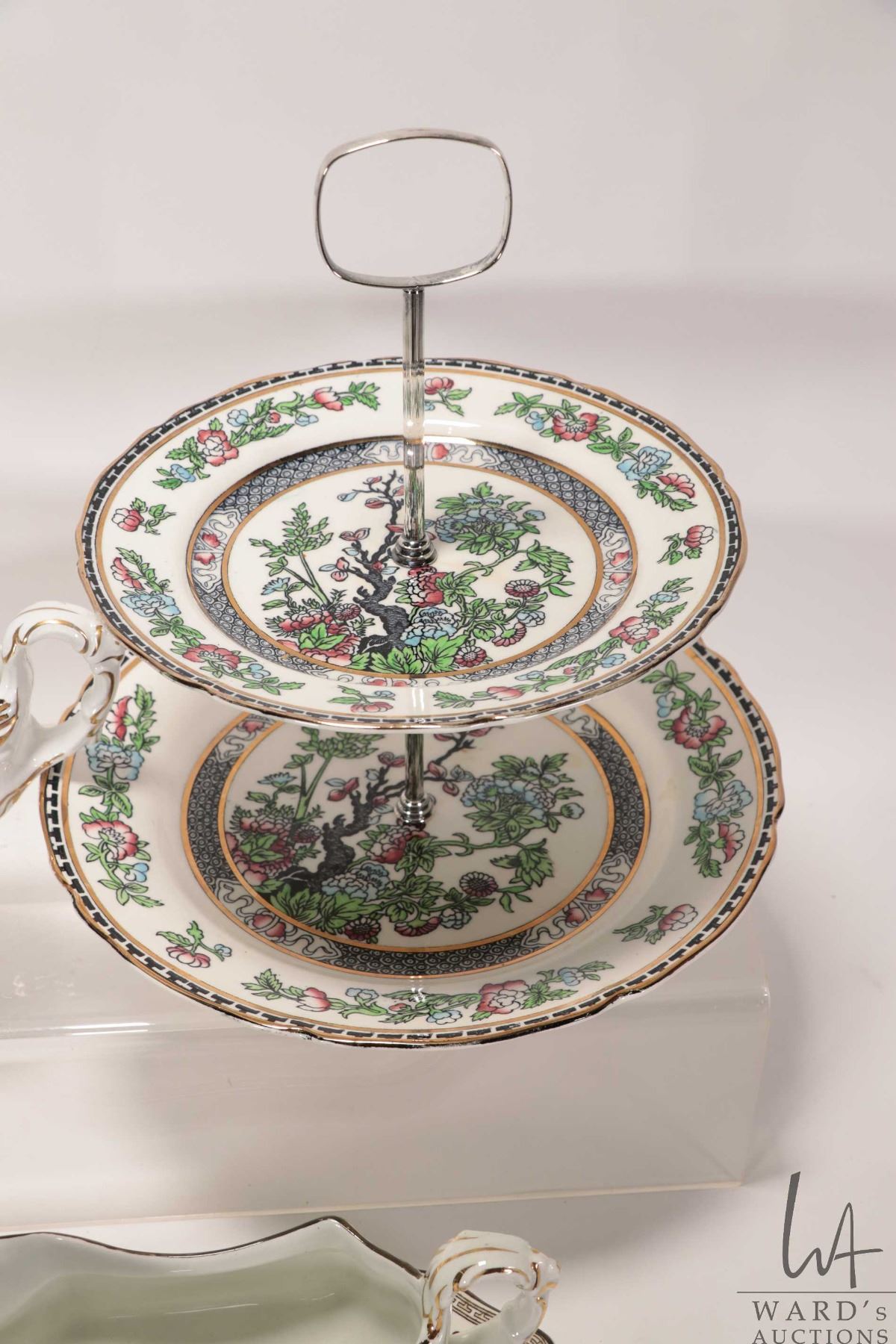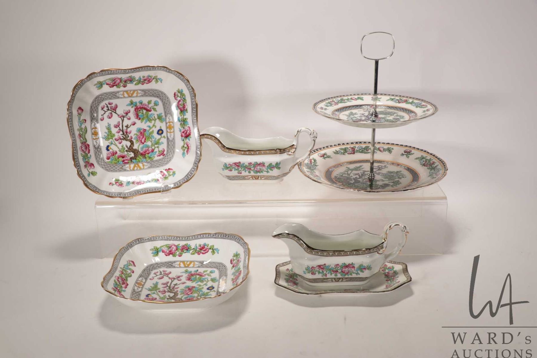 Selection of vintage Indian Tree china including two Aynsley 8" X 8" dishes, Bridgewood sauce boat marked "Harrods Ltd. London" a Bridgewood sauce boat with drip tray and a two teir Midwinter cake plate