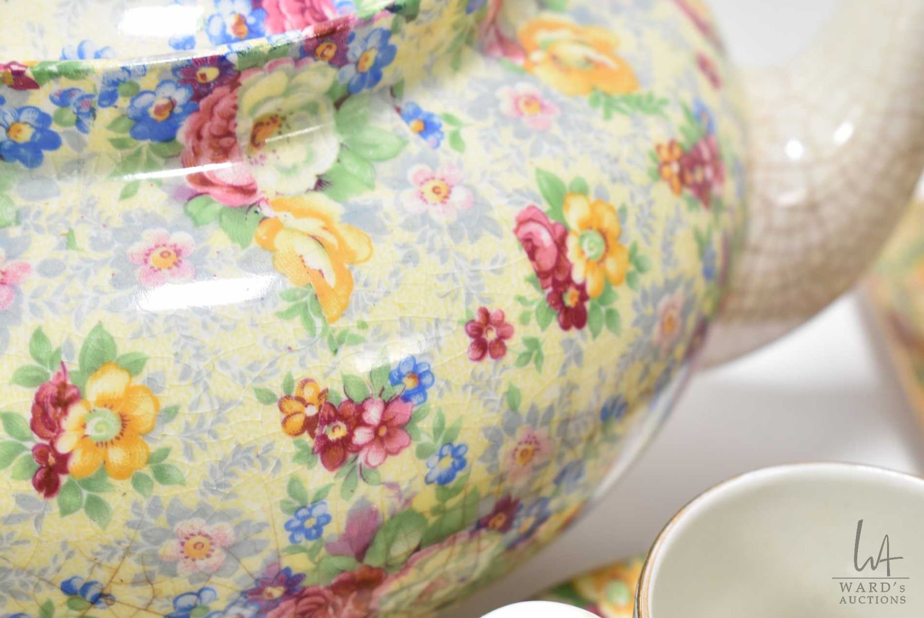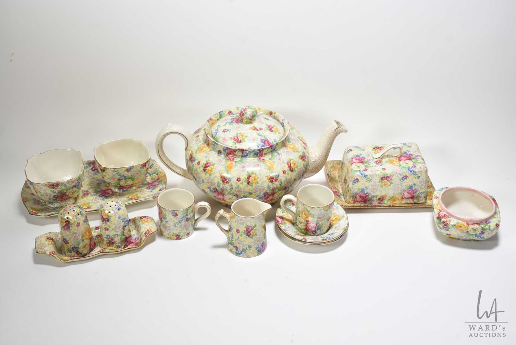 Selection of vintage Lord Nelson "Rose Time" chintz china including tea pot, two open sugar bowls, small tray, two demitase cups and saucers, small dish, creamer, lidded cheese keep plus a set of shakers with tray, note repair to tray