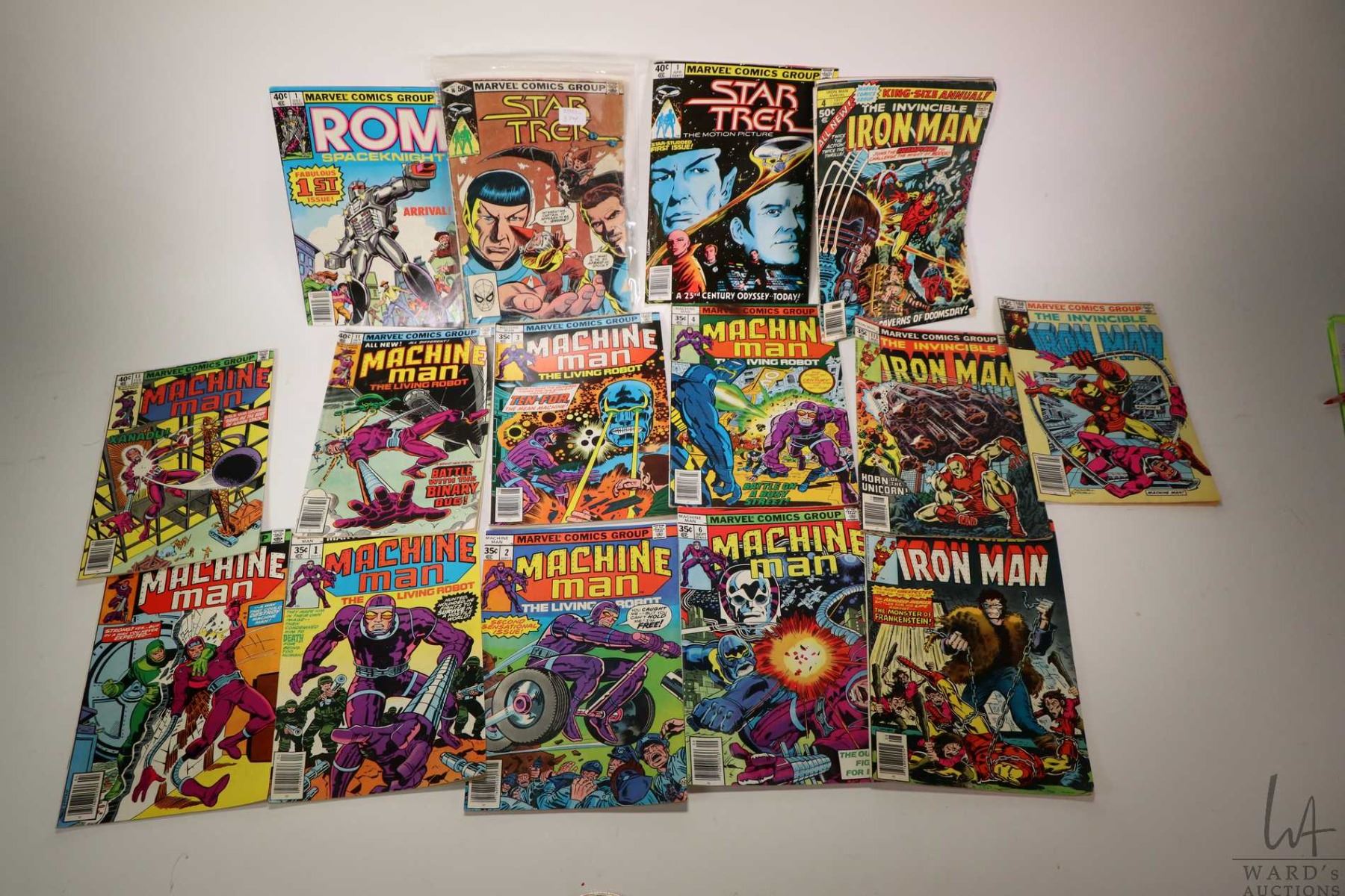 Selection of vintage Marvel comic books including "Star Trek, Rom, Machine Man, Iron Man, 2001 A Spa