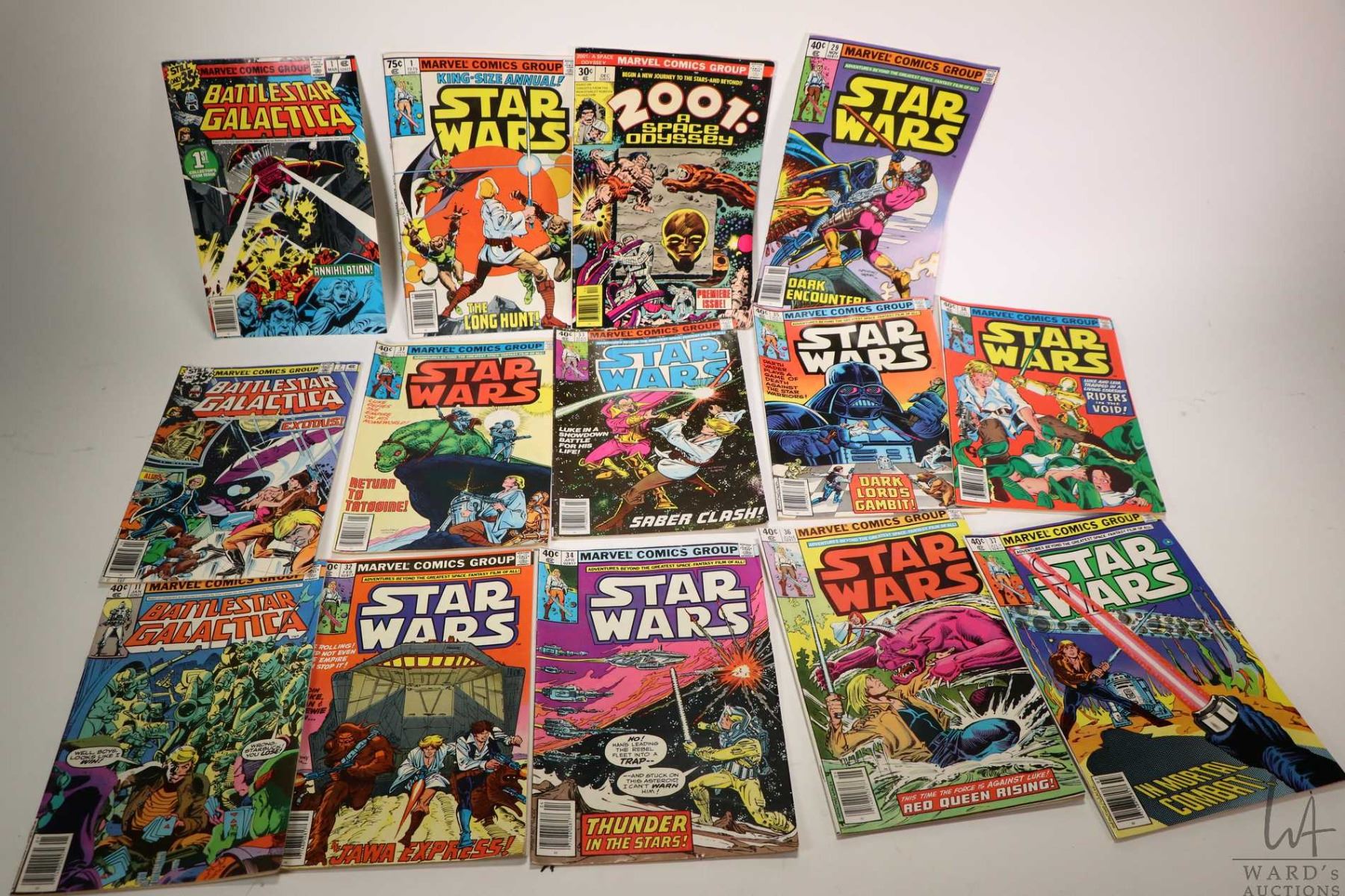Selection of vintage Marvel comic books including "Star Trek, Rom, Machine Man, Iron Man, 2001 A Space Odyssey, Star Wars and Battle Galatica", ranging in price from 30-75 cents, thirty in total