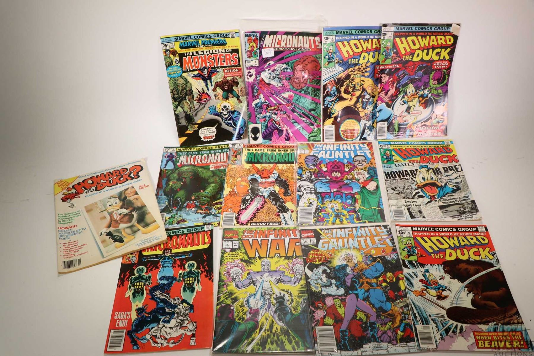 Selection of vintage Marvel comic books including "The Legion of Monsters, Micronauts, The Infinity War, The Infinity Gauntlet and Howard the Duck", ranging in price from 25 cents to $2.50, thirteen in total