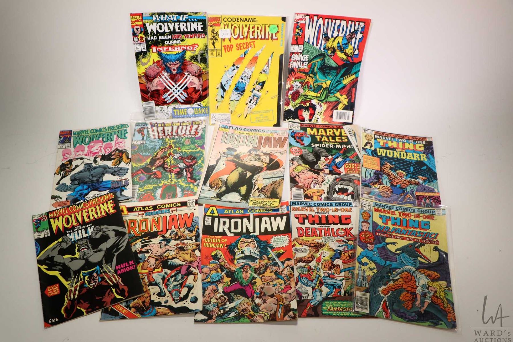 Selection of vintage Marvel comic books including "Wolverine, Hercules, Iron Jaw, The Thing, Fantast