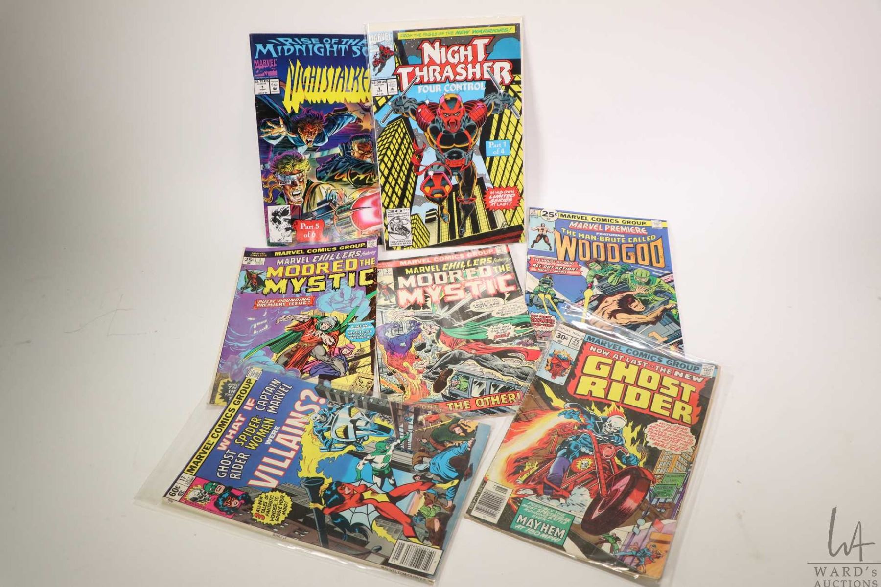 Selection of vintage Marvel comic books including "Wolverine, Hercules, Iron Jaw, The Thing, Fantastic Four, Madred The Mystic, Night Stalker, Night Thrasher, Indiana Jones, G.I. Joe and Fighting Marines" ranging in price from 25 cents to $1.75, thirty two in total