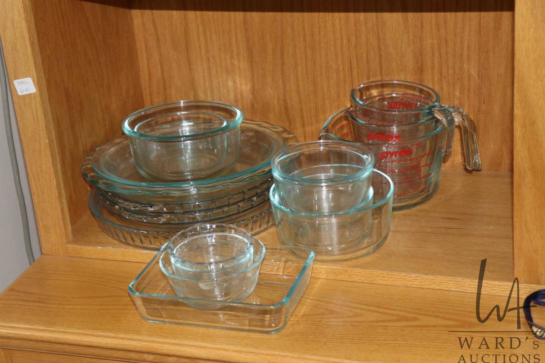 Selection of vintage Pyrex cookware including four pie plates ten clear refrigerator boxes, and thre
