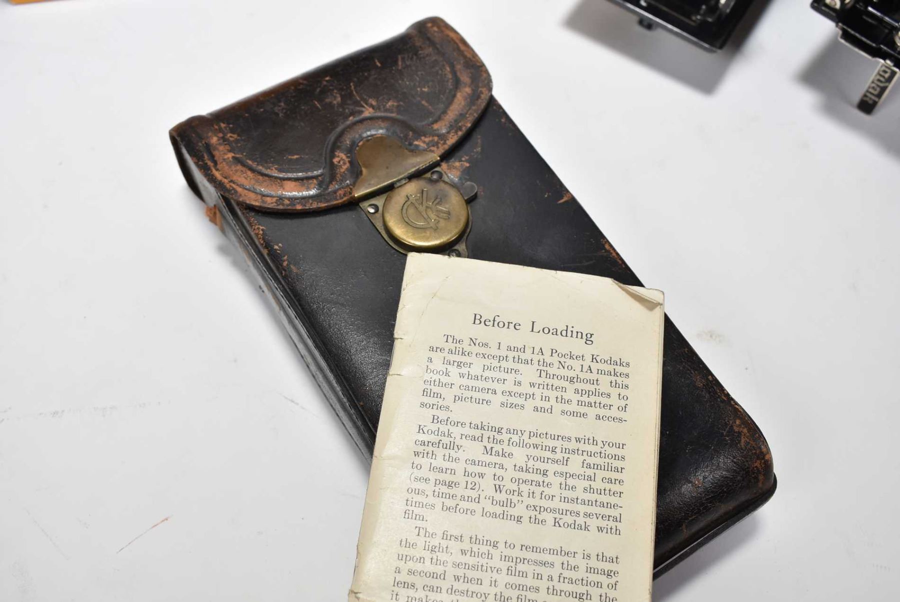 Selection of vintage and antique Kodak cameras including 6-16 bellows in leather case, 1A bellows in leather case and a boxed Brownie Hawkeye with accessories including Midget flash holder, plus a boxed Brownie Holiday flash camera